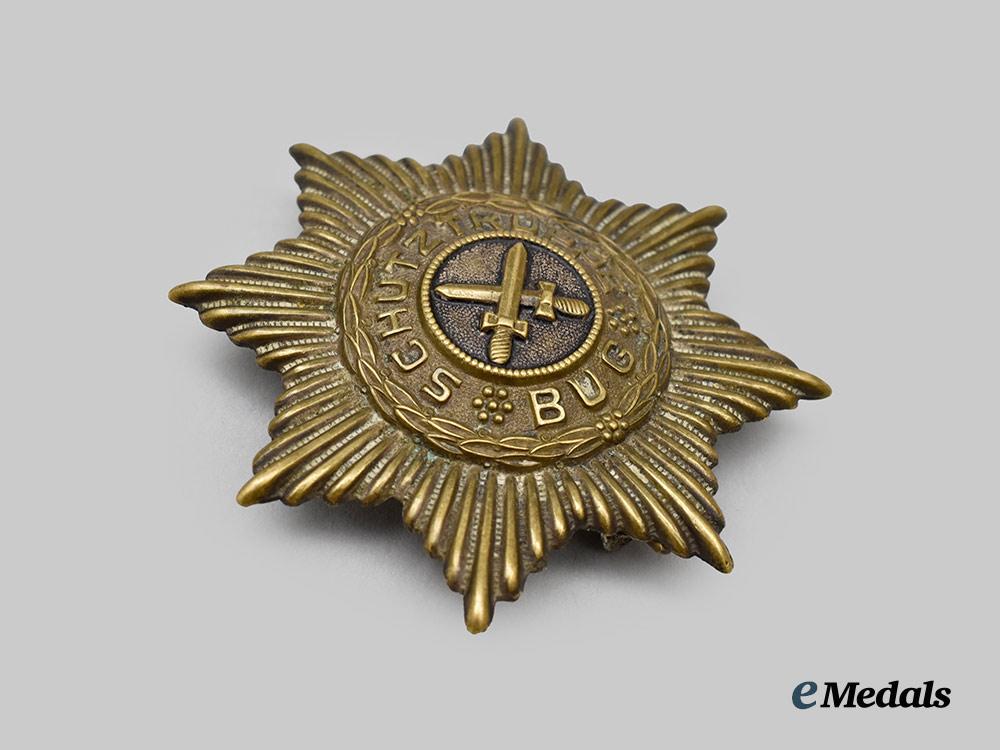 (Bug-Stern). Constructed of silvered brass, the obverse consisting of an eight-pointed radiant star, bearing a central pair of crossed swords, circumscribed by an inscription of “SCHUTZTRUPPE BUG”, in turn surrounded by a circular laurel leaf wreath, the reverse with a crimped hinge and vertical pinback meeting a flat wire catch, unmarked, measuring 54.22 mm (w) x 55.02 mm (h), weighing 10.4 grams, demonstrating total loss of silver finish and black paint to the base metal and centrepiece, respectively, in very fine condition.