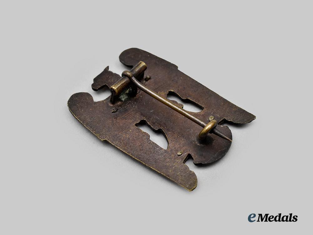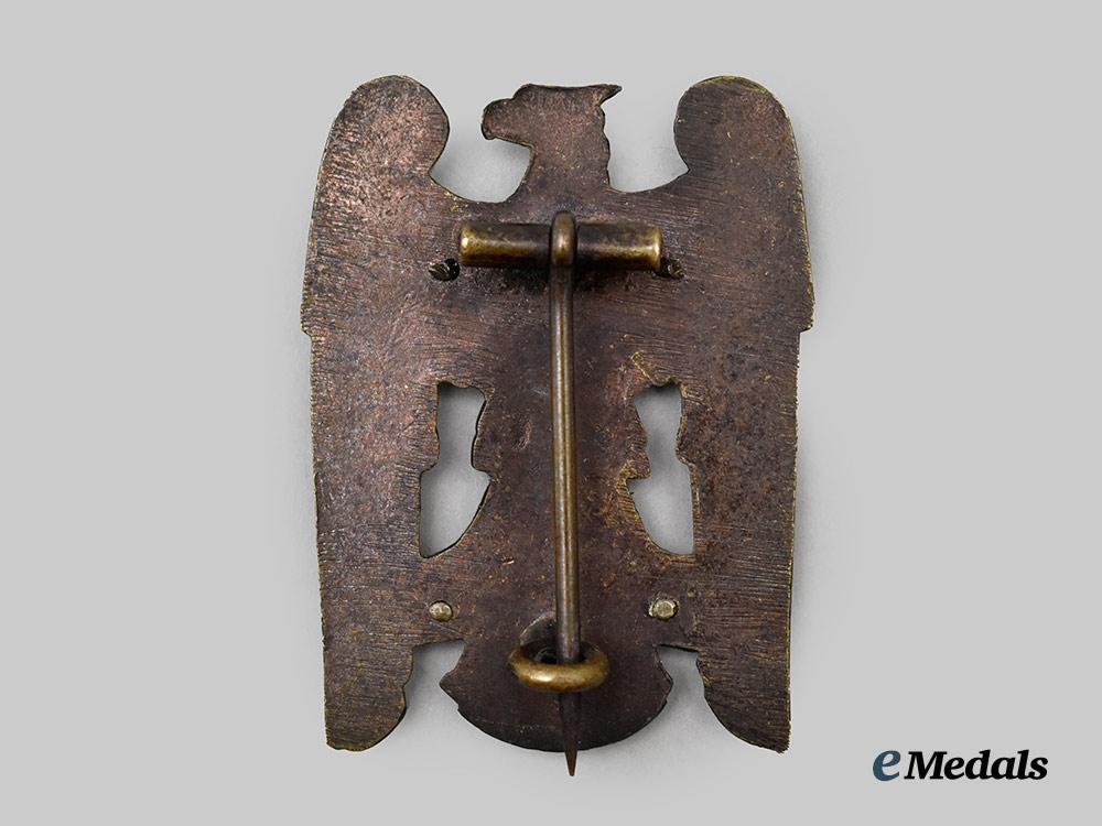 (Schlesischer Adler I. Klasse). Constructed of tombak, the obverse consisting of a Silesian-style German national eagle, clutching a silvered banner in its talons bearing a raised inscription of “FÜR SCHLESIEN” (“FOR SILESIA”), overlaid across it chest by a silvered Brustmond, the reverse with four visible rivets securing the obverse features in position, with a wide crimped hinge and vertical pinback meeting a round wire catch, unmarked, measuring 32.50 mm (w) x 42.76 mm (h), weighing 15.7 grams, demonstrating a consistent patina throughout, in better than very fine condition.