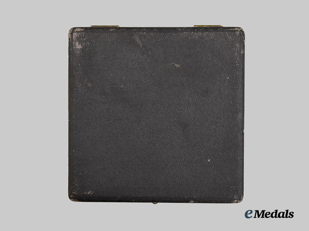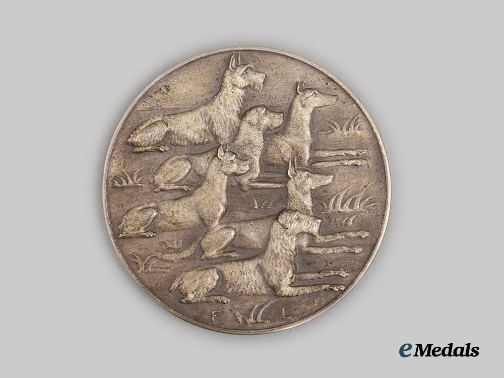 (Bayerischer Staatspreis für die Heranbildung von Polizeihunden in Silber mit Etui). Constructed of silver, the obverse bearing a raised depiction of multiple dogs in prone position, the reverse bearing a central raised inscription of “STAATSPREIS FÜR VORZÜGLICHE LEISTUNGEN IN DER HERANBILDUNG VON POLIZEI-HUNDEN” (“STATE AWARD FOR EXCELLENT ACHIEVEMENTS IN THE TRAINING OF POLICE DOGS”), circumscribed by an inscriptions of “BAYERISCHES STAATSMINISTERIUM DES INNERN 1928” (“BAVARIAN INTERIOR MINISTRY 1928”), the obverse engraver marked “FL” for Friedrich Lommel, the edge stamped with a crown and crescent indicating German manufacturer, alongside a silver content number of “900”, measuring 54.88 mm in diameter, weighing 65.8 grams, accompanied by its period original presentation case, constructed of a wooden frame with a faux black leather exterior liner, the interior with a padded satin lid liner and depressed dark blue velvet medal bed, closing with a functional metal spring catch with exterior stud release, unmarked, measuring 92 mm (w) x 92 mm (l) x 20 mm (h), in overall extremely fine condition.