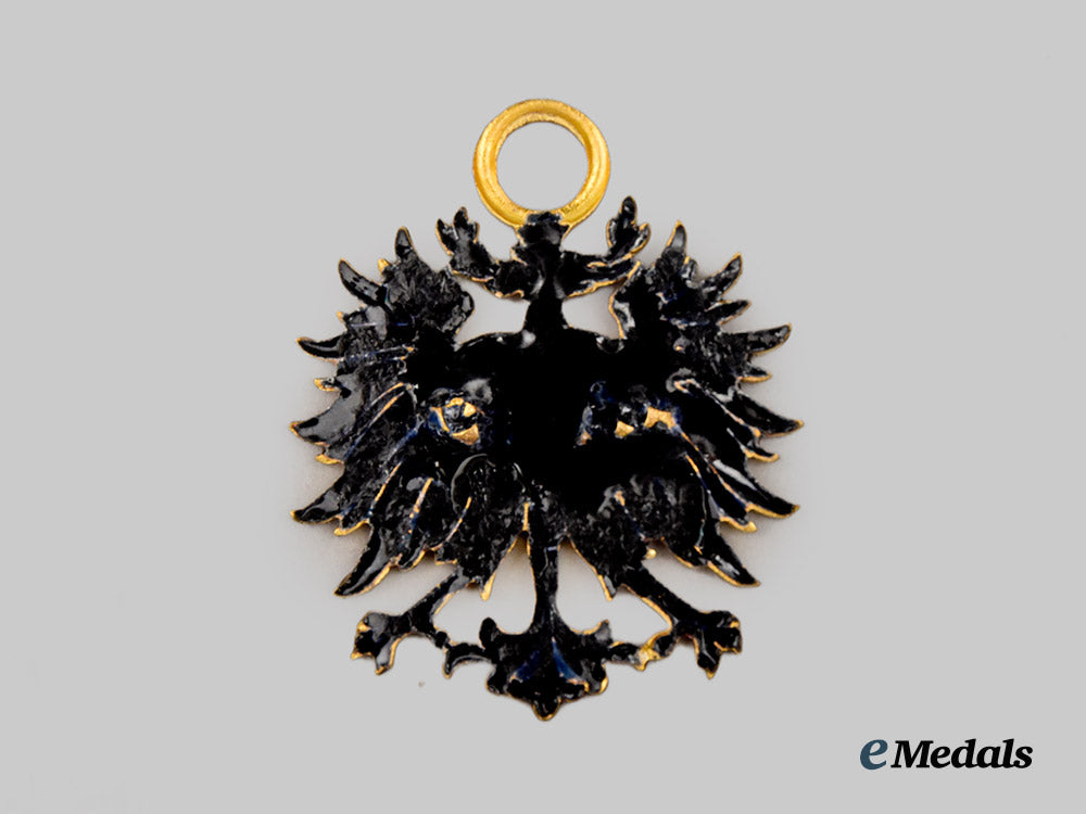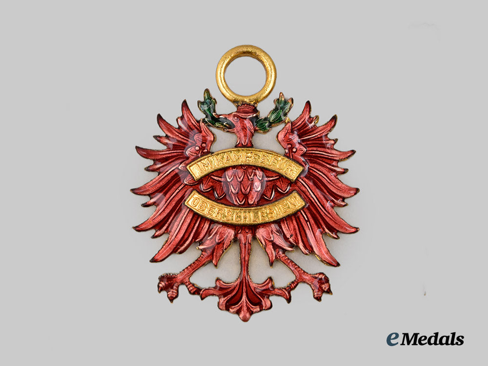 (Der Tiroler Adler der Sturmkompanie Tirol des Freikorps Oberland). Constructed of gilded bronze with multi-coloured enamels, the obverse consisting of a detailed Tyrol-style German national eagle executed in red enamels, with a semi-circular green enameled laurel wreath set behind its head, overlaid across the chest by two gilded banners bearing an inscription of “IM KAMPFE FÜR OBERSCHLESIEN” (“IN THE FIGHT FOR UPPER SILESIA”), topped by a suspension loop, unmarked, measuring 41.46 mm (w) x 50.12 mm (h), weighing 15.2 grams, in extremely fine condition.