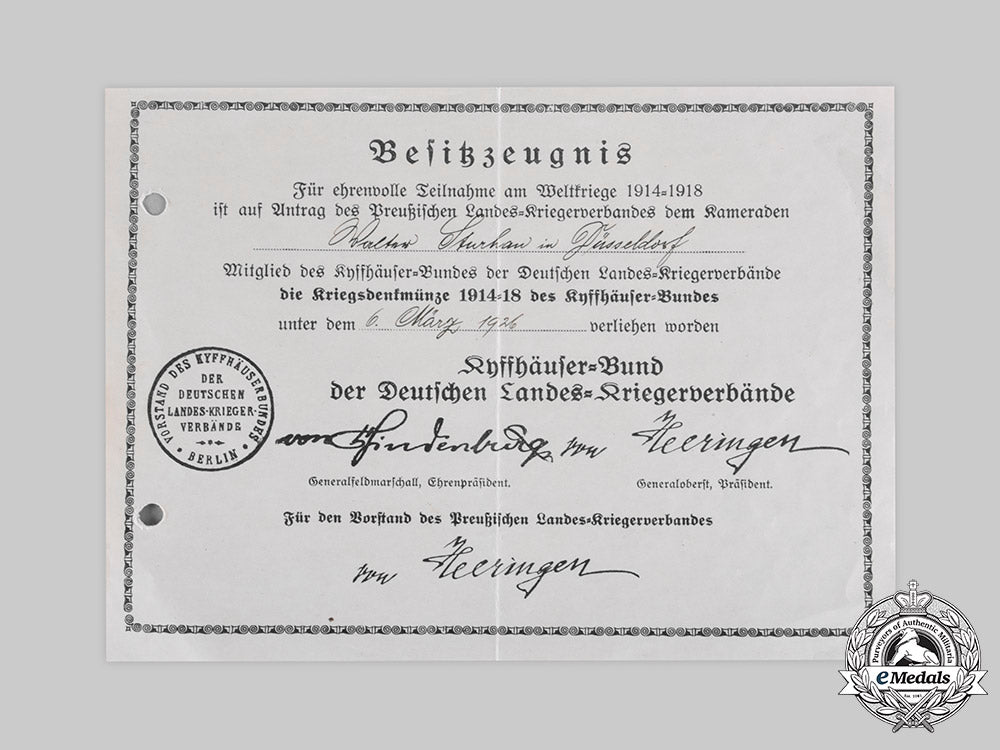 Germany, Weimar Republic. A Kyffhäuser League War Medal Certificate To Walter Sturhan