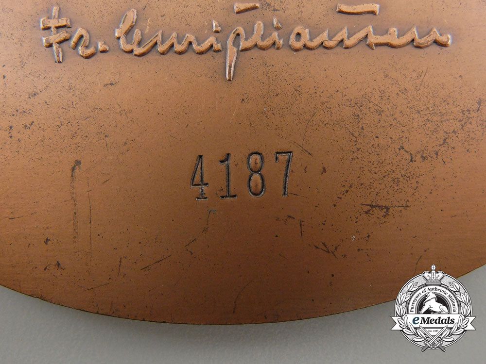Die-struck alloy with a bronze wash, horizontal oval, obverse illustrating an embossed winged man (Icarus) in flight, a swastika superimposed on his legs and a semi-circular banner above with the recessed letters "NSFK", surrounded by the inscription in Gothic type "Nationalsozialistiches Fliegerkorps Deutschlandflug 1938" (National Socialist Flying Corps German Flight 1938), reverse inscribed in embossed Latin block script, "Mit unserem Führer im gleichen schritt und tritt fliegen wir für unser ewiges Deutschland" (In equal pace and stride with our Führer we fly for our eternal Germany), embossed facsimile signature of the NSFK leader, Friedrich Christiansen and number stamped "4187" below, 77 mm x 94.7 mm, light contact, near extremely fine.