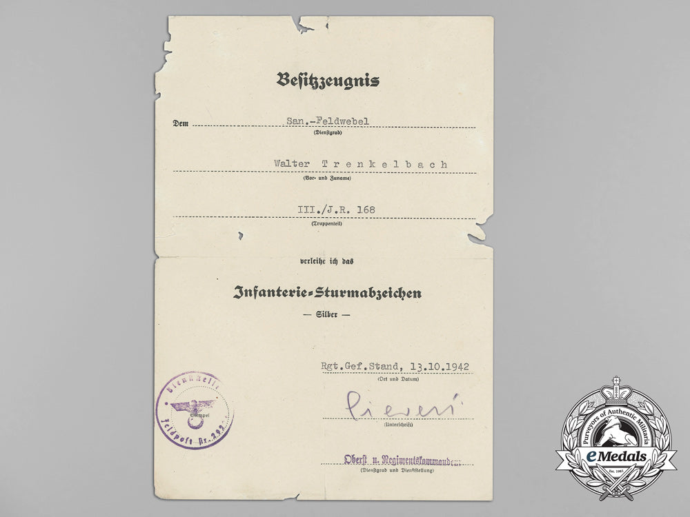 An Infantry Assault Badge In Silver To Medical Sergeant Of Infantry Regiment 168