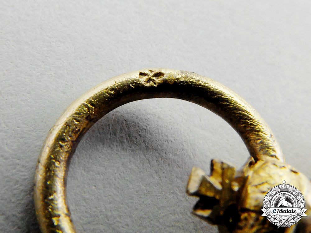 A well preserved example of a 1913-1918 issue Bavarian Order of Military Merit Cross First Class with Swords and Crown; silver gilt Maltese cross with black and white enamels; the obverse with a central black enameled medallion bearing a gold crowned cipher of King Ludwig III within a white enameled border in the form of a buckled belt with gold letters reading “Merenti” (Latin - “Merit”); the reverse with a central gilt medallion bearing a golden crowned Bavarian lion within gilt border in the form of a buckled belt with golden numbers reading “1866”; with the swords attached to the cross directly above the upper arm; suspended from a swivel crown suspension, with a horizontally pierced ball and a period original but incorrect ribbon; ring marked with an asterisk, denoting that a higher grade of this award was awarded to the recipient - likely Austrian; measuring 43.42 mm x 67.58 mm; weighing 22.0 grams; with the gilt and enamels extremely well preserved; in virtually mint condition.