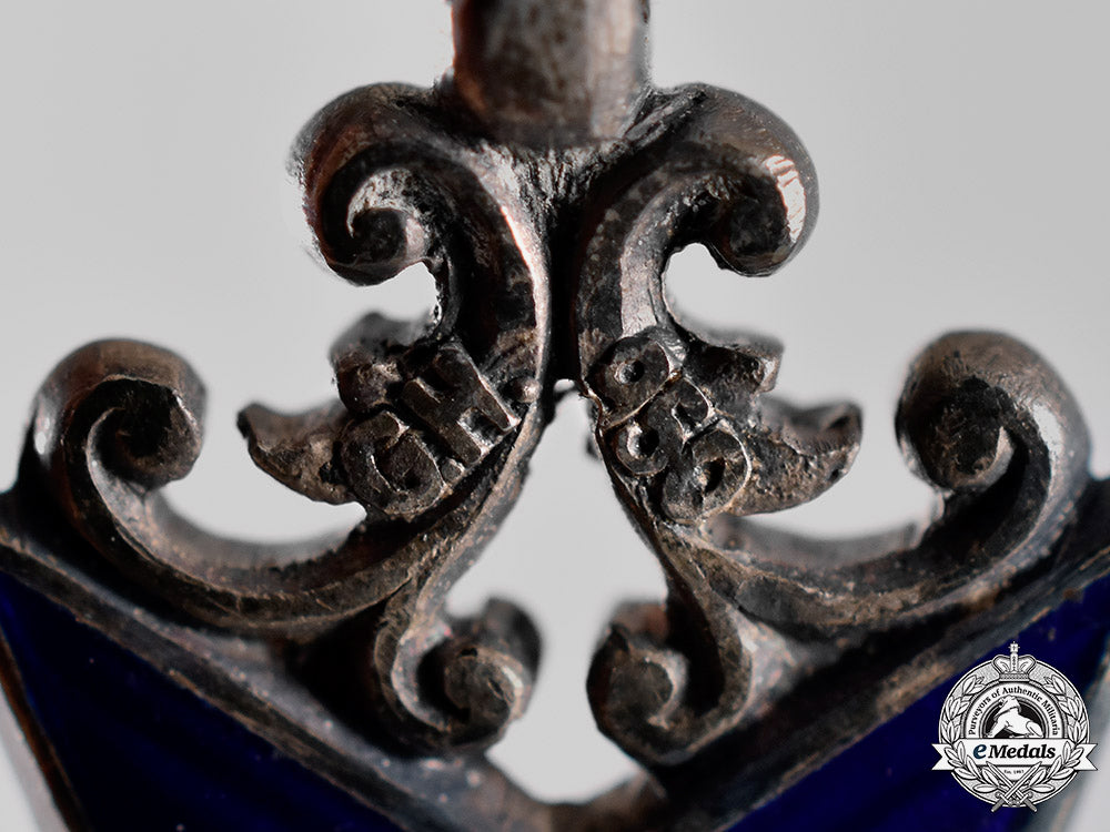 (Bayerische Militärverdienstorden IV. Klasse). Issued 1905-1918. A silver Maltese cross with blue enameled arms, and with flames between the arms of the cross; the obverse with a central black enameled medallion bearing a silver crowned cipher of King Ludwig III within a white enameled border in the form of a buckled belt with silver letters reading “MERENTI” (Latin - Merit); the reverse with a central black enameled medallion bearing a silver crowned Bavarian lion within a white enameled border also in the form of a buckled belt, dated “1866”; suspended from arabesques - marked “GH” for “Gebrüder Hemmerle, München” and “900” for silver content; measuring 40.78 mm (w) x 41.66 mm (h); weighing 24.6 grams; in overall extremely fine condition.