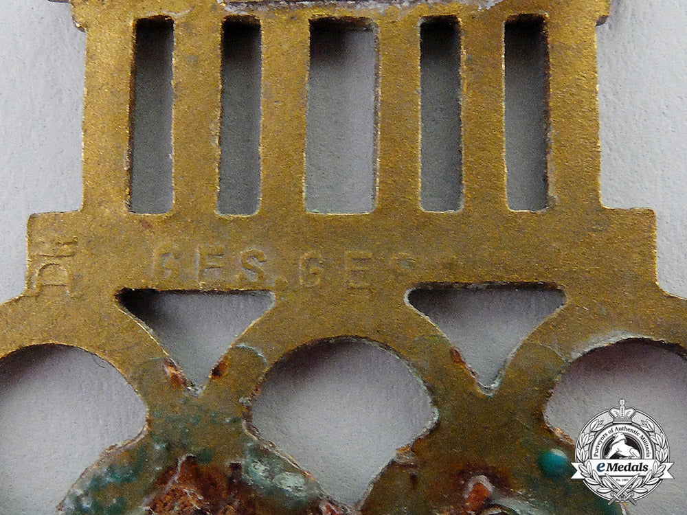 In gilt metal (magnetic) and white enamels; horizontal pinback; maker marked with the stylized logo of “Hermann Aurich, Dresden” on the reverse; measuring 30 mm (w) x 33 mm (h); with signs of oxidation from age; in overall fine condition.