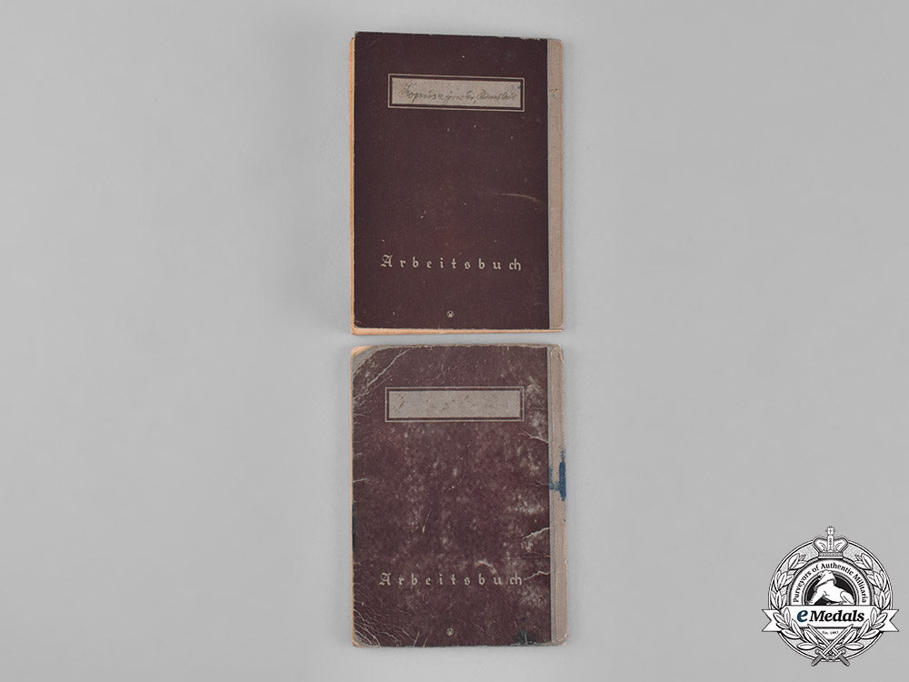 A pair of of employment record books (Arbeitsbücher), including a book belonging to Anton Wiebeck. Wiebeck was born on 17 May 1901, and had two children, born 1930 and 1934, respectively. He was employed as a bank clerk through August 1941. Measuring 105 mm (w) x 147 mm (h). Minor soiling and fatigue, but otherwise in very fine condition.