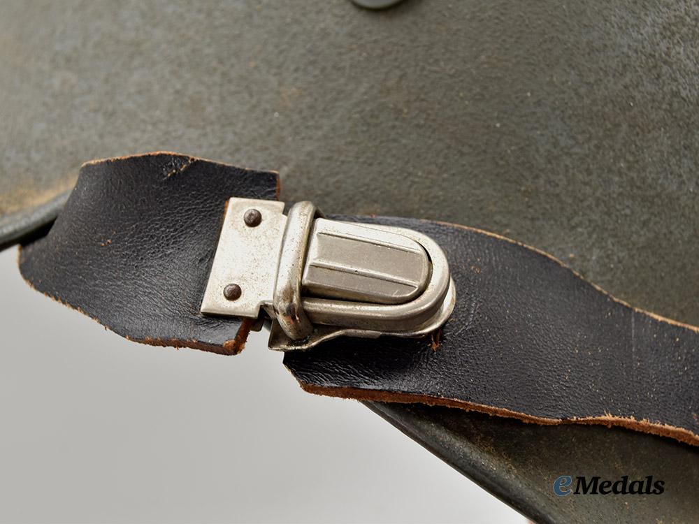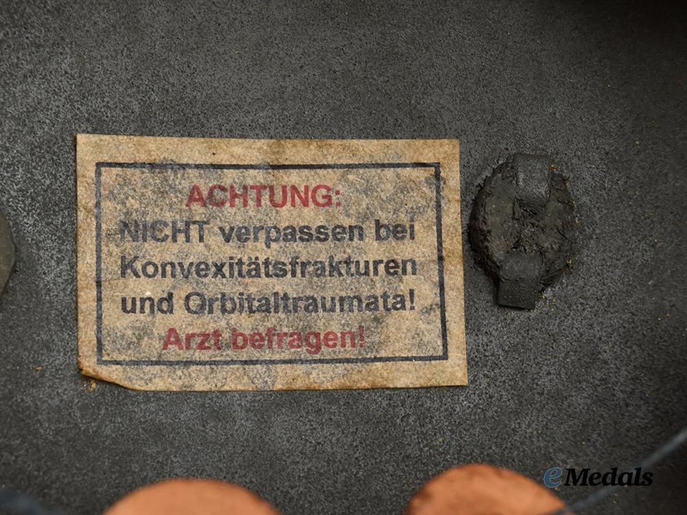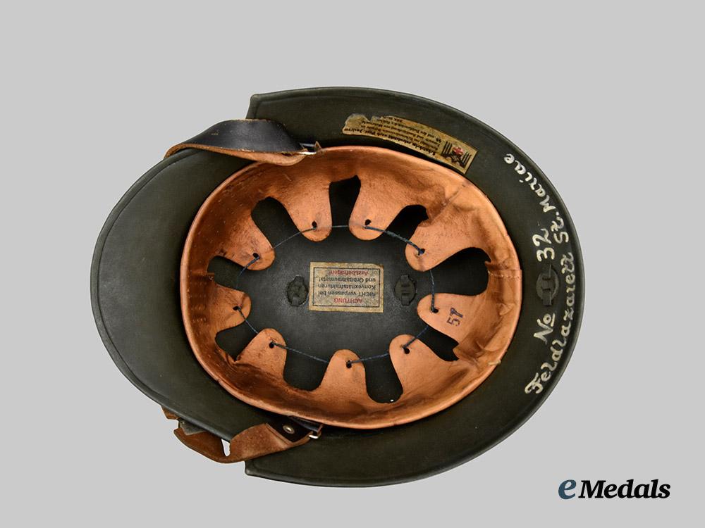 (Deutsches Rotes Kreuz Schutzhelm M34 für Mannschaften). An unusual and well-preserved German Red Cross (DRK) personnel Stahlhelm (steel helmet)/Schutzhelm, constructed of a single sheet of magnetic molybdenum steel which retains virtually all of a period olive-drab paint textured with fine wood dust. Four rivets are distributed around the outer circumference for the accommodation of the interior fixtures, while three additional rivets distributed over the crown and at the back cover eyelets perforated into the shell for the inclusion of a comb when utilized as intended by Feuerschutzpolizei personnel. The helmet is flanked on each side by dual ventilation outlets consisting of clusters of seven perforations. Situated below the left vents is an unusual painted decal consisting of a white shield bearing a black and red German Red Cross-style eagle above a unit attribution of “NO 32”, while the area below the right vents additionally features a painted white shield bearing a red Geneva Cross defaced by a white mobile swastika, similarly situated above a dedication of “NO 32”. Each decal measures 38 mm (w) x 48 mm (h) and demonstrates expert application. The edge of the skirt is fully crimped, providing a smooth edge. The interior features a light brown leather liner which culminates in nine fingers, each perforated at the top with an eyelet for the inclusion of a drawstring. Two metal rings emanate from the sides of the liner for the accommodation of a multi-piece blackened leather chinstrap, itself adjusted with a metal buckle and closed with a functional spring catch. Both the crown and side of the interior retain mostly-intact labels featuring instructions for personnel, while the back of the skirt bears a handwritten inscription of “NO 32 FELDLAZARETT ST. MARIAE”. Otherwise unmarked, the helmet measures approximately 21.5 cm (w) x 27.5 cm (l) x 15.5 cm (h). Demonstrating no notable damage or wear, this interesting helmet, repurposed from a variant commonly worn by Feuerschutzpolizei personnel, remains in an extremely fine condition.