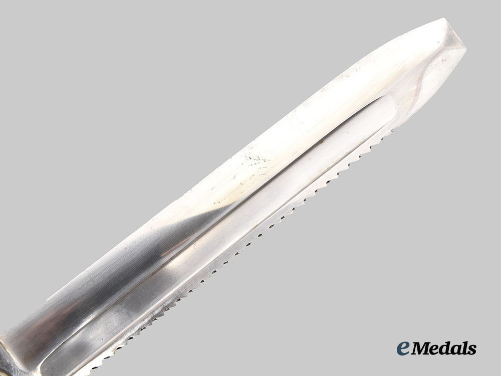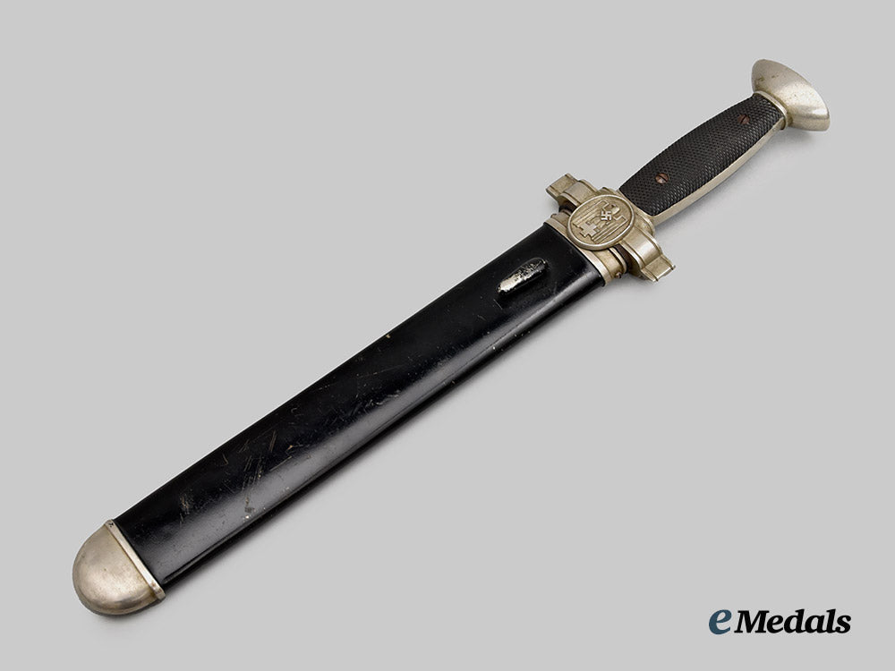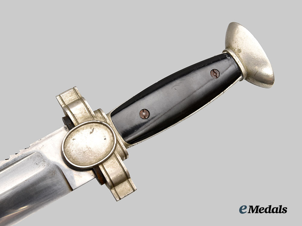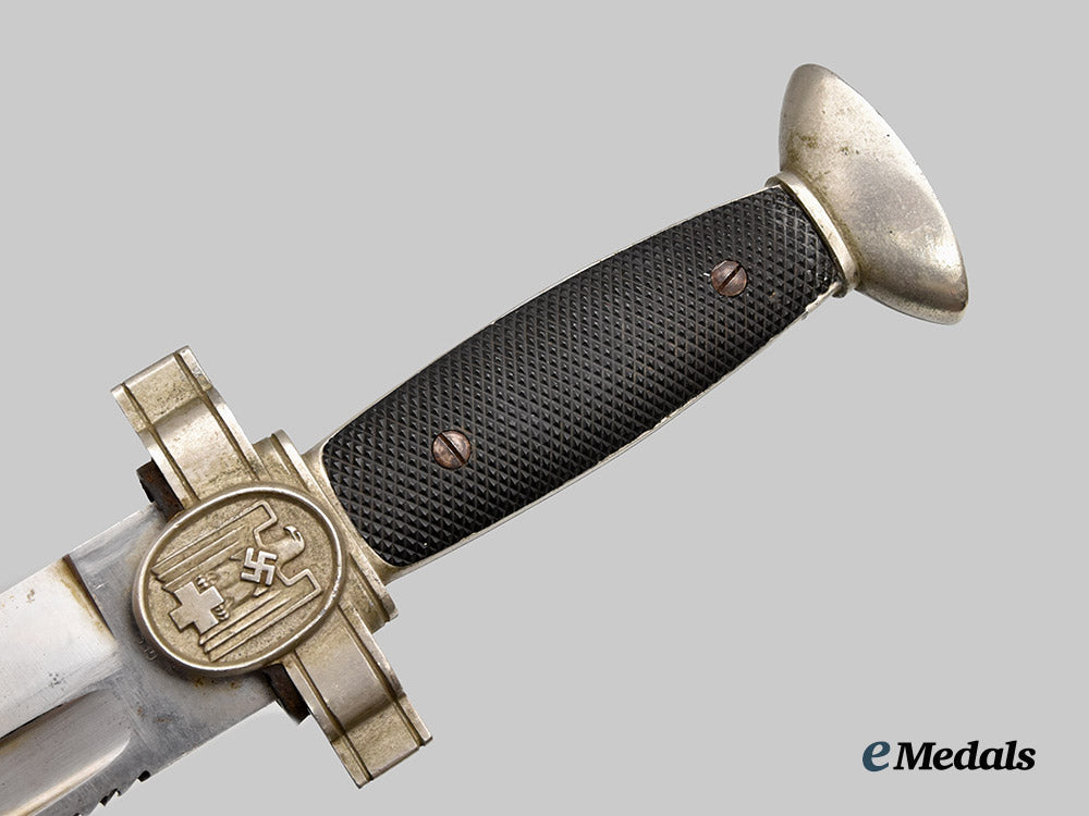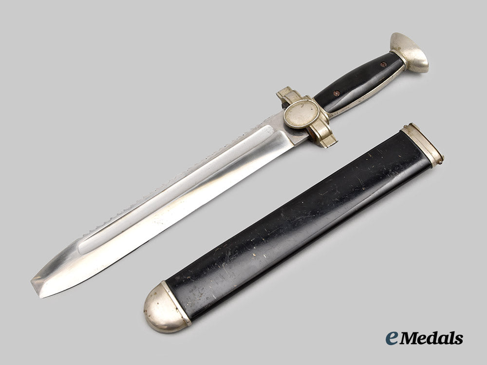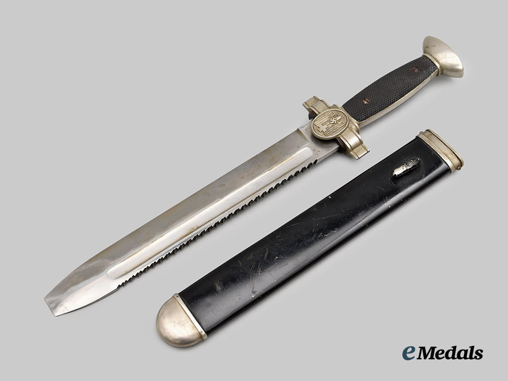 (Deutsches Rotes Kreuz Hauer für Mannschaften und Unterführer). A very well-preserved Deutsches Rotes Kreuz (German Red Cross/DRK) Enlisted ranks hewer, measuring 41.5 cm in total length when inserted into the scabbard. It features a 27 cm-long, nickel-plated, magnetic steel blade with a blunted tip and serrated lower edge. A fuller runs the majority of the length of the lower edge of each side of the blade. It sits securely within a nickel-plated alloy crossguard which bears double-sided oval medallions, the obverse of which is overlaid by a DRK-style German national eagle, defaced by a mobile swastika and clutching a Geneva Cross. An intact blackened leather buffer pad covers the seam where the blade meets the crossguard. The hilt is constructed of a nickel-plated alloy and features pebbled black bakelite handle grip, secured in place with dual magnetic metal rivets. The hewer is accompanied by its original scabbard, constructed of a black painted magnetic metal shaft with nickel-plated magnetic fixtures riveted to both the tip and throat. A spring catch within the latter firmly holds the hewer in place during storage. A downward-pointing hook emanates from the side of the shaft for the accommodation of a frog. Unmarked, the hewer demonstrates issues consistent with age and wear, including running marks to the blade, minor oxidation of the nickel-plating, and some scratching to the scabbard with consequent loss of paint. The hewer remains in an overall near extremely fine condition.