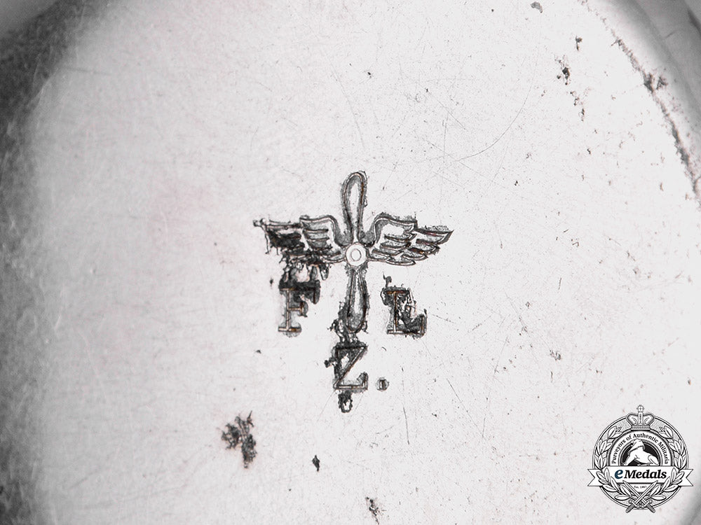 (Taschenuhr). A steel-cased, magnetic, non-functional pocket watch with an inverted face allowing the pilot to read the time without having to turn the watch the opposite way, the white enamelled face has bold numerals in black, marked “EIGENTUM DER FLIEGERTRUPPEN” (“PROPERTY OF THE FLYING CORPS”), with steel blue hour and minute hands, each minute position marked with black rules, a steel blue secondhand partially obscures the 12 o’clock position, maker mark “F.W. KREIS, BERLIN. W.,” the reverse stamped with the Flying Corps’ winged propeller insignia and FLZ, indicating that it was used by a member of a Zeppelin airship crew circa 1915, the inside cover is inscribed with “356 u 94 u,” “B21/10-46,” “B2/6-50,” and “AHsberj,” measures 52.55 mm (w) x 63.39 mm (h - inclusive of ball finial), weighs 84.9 grams, shows major wear and cracking, and in good condition.