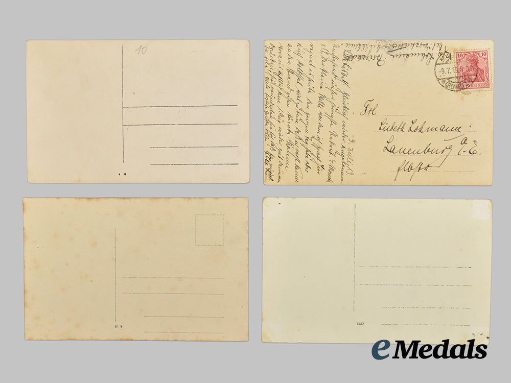 3. One group photograph of members of Freiwilliges Landesschützenkorps wearing a unique mixture of Freikorps and Reichswehr uniforms, with one soldier notably wearing the Order of Queen Tamara, the reverse in unused postcard format, unmarked, measuring 14 cm (w) x 9 cm (h), in extremely fine condition.