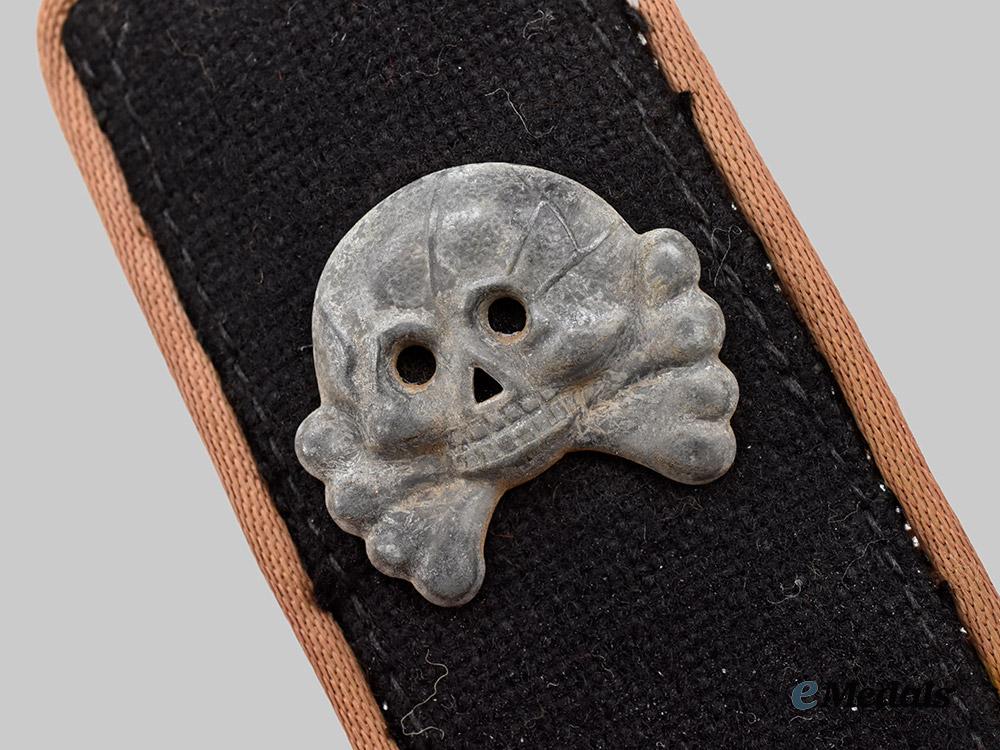 1. A matching set of Armored Reconnaissance collar tabs, each constructed of black wool with buckram cores, trimmed with copper-brown piping, and pinned with a silvered zink Danziger-style Totenkopf, both unmarked and measuring 35 mm (w) x 75 mm (l), a scarce pair in use from late 1941 until early 1943 in uniform-removed and near extremely fine condition.