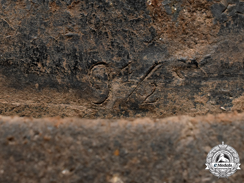 (Marschstiefel). A pair of tall, blackened leather construction boots, with black buckles on the upper outer edges, the leg portion measures 47.5 cm high from the heel to the upper edge, the rear seam is reinforced and covered by a 1.5 cm wide leather band, sewn to the inside on both sides of the legs are double-laid pulling straps of webbing 3.8 cm wide, the heel part is reinforced by a leather cap nearly ankle-high, and reaching to both sides of the heels, the forward half-sole presents hobnails, the interiors present partial lining in brown leather, stamped with sizes 9½ 6 48 39, also with the serial number 7 3910, stamped with the maker mark BÄREN-STIEFEL K.G., and in overall worn.