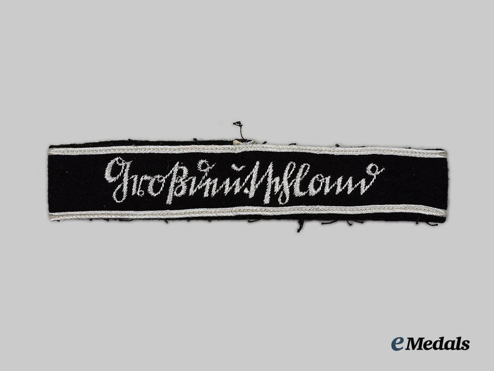 (Heer Ärmelband Großdeutschland für Offiziere). Constructed of black wool, the obverse trimmed along both the top and bottom edges with silver aluminum wire tresses, bearing a central silver aluminum wire inscription of “GROßDEUTSCHLAND” executed in Sütterlin script, the reverse notably demonstrating an unusual red guide thread, unmarked, measuring 34 mm (w) x 390 mm (l), in uniform-removed and extremely fine condition.