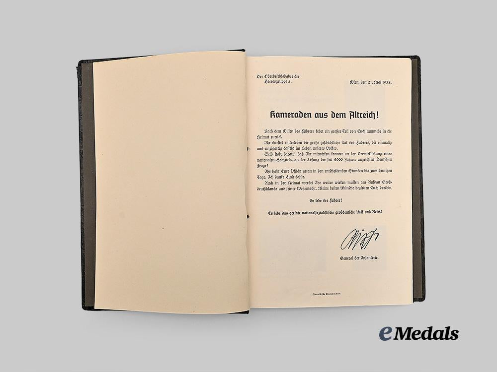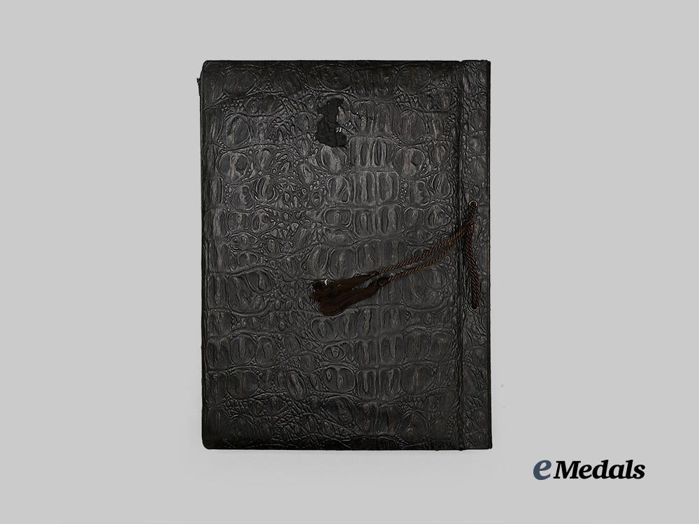 (Heer Gebirgsjäger Fotoalbum und Verleihungsurkunden). Constructed of a card stock binding with a faux textured dark brown leather liner, the spine perforated with four eyelets reinforced with magnetic metal grommets through which is looped a drawstring which maintains the album’s structural integrity, the cover bearing a silvered Wehrmacht eagle clutching a wreathed mobile swastika and unit dedication of “GEB. JÄGER-REGIMENT 98”, the interior content opening with a typewritten history of Gebirgs-Jäger-Regiment 98 and a patriotic history of German forces, supplemented with black-and-white photographs and illustrations, followed by promotion and award documents named to Andreas Lamminger, with the latter consisting of a document for the Wehrmacht 4-Year Long Service Award (named to Lamminger as an Unterfeldwebel of 7. Kompanie, Gebirgs-Jäger-Regiment 100) and the Anschluss Medal (dated 8 November 1938 and named to Lamminger as an Untefeldwebel of 7. Kompanie, Gebirgs-Jäger-Regiment 98), concluding with 11 black card stock pages for the addition of photographs, each separated by an intact wax paper divider to protect the images, measuring 22.5 cm (w) x 30 cm (h), demonstrating minor fatigue to the cover, an interesting and owner-attributed example which remained largely unused for unknown reasons, in extremely fine condition.