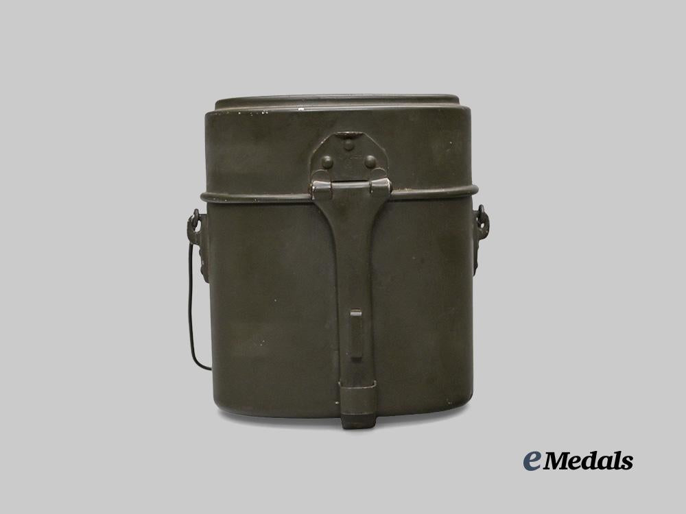 (Kochgeschirr M1910). Constructed of an aluminum shell with a toned field-grey exterior paint scheme, featuring a retractable lid situated on a swivel hinge and fastening closed with a frontal clip, flanked on each side by eyelets retaining an aluminum handle, the lid opening to reveal a plain and hollow interior, the exterior marked with a Reichszeugmeisterei (RZM) logo and maker code “M6/11/39” indicating late prewar or early wartime manufacture, measuring 17 cm (w) x 19.5 cm (h), in extremely fine condition.