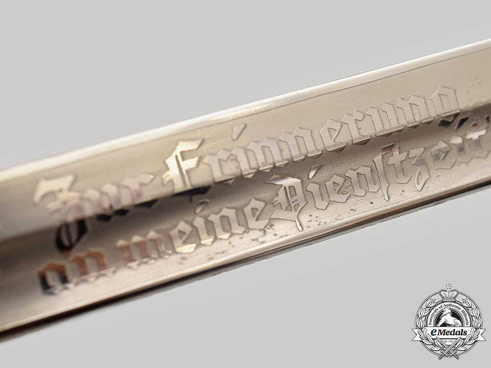 (Heer Offiziersschwert). An extremely well-preserved and high-quality Heer Officer’s commemorative dress sword, measuring 97 cm in total length when inserted into the scabbard. It features an 81 cm-long nickel-plated magnetic steel blade with a sharpened tip and unspoiled edges. Each side of the blade features a fuller which runs approximately two-thirds of the length of each blade. Acid-etched onto the obverse is an inscription of “ZUR ERINNERUNG AN MEINE DIENSTZEIT” (“IN MEMORY OF MY SERVICE TIME”, flanked on each side by arabesque designs with centrepieces consisting of a pair of crossed rifles overlaid by a Stahlhelm and a Wehrmacht eagle clutching a wreathed mobile swastika. The reverse features an exceptionally detailed, acid-etched cavalry scene, flanked by identical arabesques designs and Heer symbolism, likely indicating that the owner served with an armoured cavalry unit. The reverse ricasso is maker marked with the logo of Alcoso, Solingen, for the former firm of Alexander Coppel, circumscribing the company’s scale logo. It sits securely within a one-piece gilded bronze hild complete with a hooked quillion and hand guard. The hilt is decorated with etched oak leaf designs and featuring a shield medallion bearing a wreathed sword overlaid by a mobile swastika at the obverse crossguard. The handle grip is composed of a single piece of ribbed black celluloid, with the ribbing retaining a period original twisted and rolled bronze wire cord. It completes with a raised Heer-style German national eagle clutching a mobile swastika on the pommel. The sword is accompanied by its period original scabbard, constructed of nickel-plated magnetic steel. An integral band near the throat retains a loop for the accommodation of hanger, while the throat itself retains a functional spring catch, firmly holding the sword in place during storage. Demonstrating only minor, sporadic loss of finish to the scabbard, this striking commemorative sword is in an overall extremely fine condition.