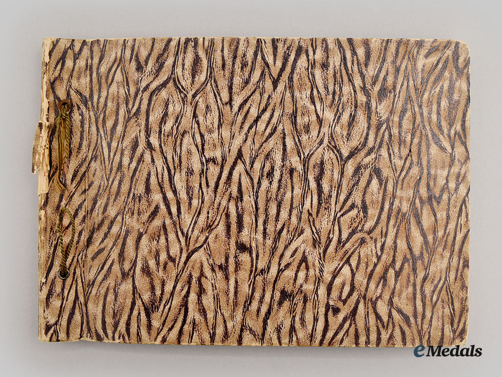 Im Kampf gegen den Bolschewismus (In Battle against Bolshevism). A large photo album totaling 70 pages with 3-10 photographs per page, as well as numerous type-written war diary letters from Neugebauer himself about the campaign in Russia. The photographs contained in this album depict life in the battlefield on the eastern front, crossing of the Neman river (marking the opening of the eastern front), extensive enemy battle damage including destroyed bridges and vehicles, Neugebauer’s experience in the hospital following his injury in the field, as well as on leave in Berlin. It also contains the award certificates for the black wound badge, the Iron Cross 1939 Second Class, as well as the General Assault Badge. The album is constructed of a cardstock core and a gray faux leather exterior liner, with a visor cap eagle insignia, the number “28” from shoulder board insignia, and a red enameled Russian star bearing a hammer and sickle, all on the exterior of the album. It measures 41 cm x 29 cm.