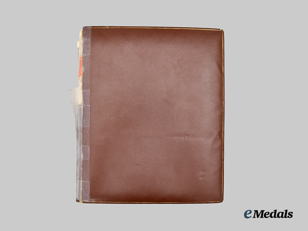 A photo album totaling 40 pages with 1-5 photographs per page, wartime newspaper clippings about Neugebauer’s extraordinary actions and heroism, pictures of the award ceremony of the Knight’s Cross of the Iron Cross 1939, the award certificates for the silver wound badge, the Iron Cross First Class, as well as the award certificate for the tank destruction badge, of which he was awarded three simultaneously for destroying 3 enemy vehicles. The album is constructed of cardstock binding with a brown faux leather exterior liner, off-white cardstock pages, and measuring 19 cm x 23 cm.