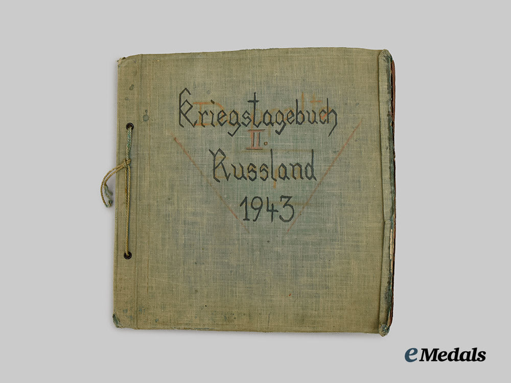 Kriegstagebuch Russland 1943 (Wartime Diary Russia 1943). A photo album totaling 40 pages with 2-4 photographs per page, as well as typewritten letters in a diary format, which together paint a picture of Neugebauer’s wartime experience in Russia, including where he was injured for the second time, for which he was awarded the wound badge in silver. The album is constructed of cardstock binding with a faded green cotton exterior liner, brown cardstock pages, and measuring 23 cm x 23 cm.