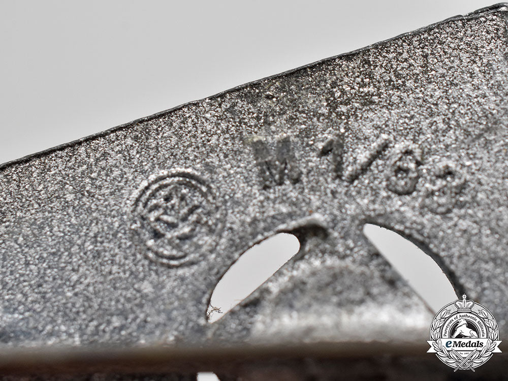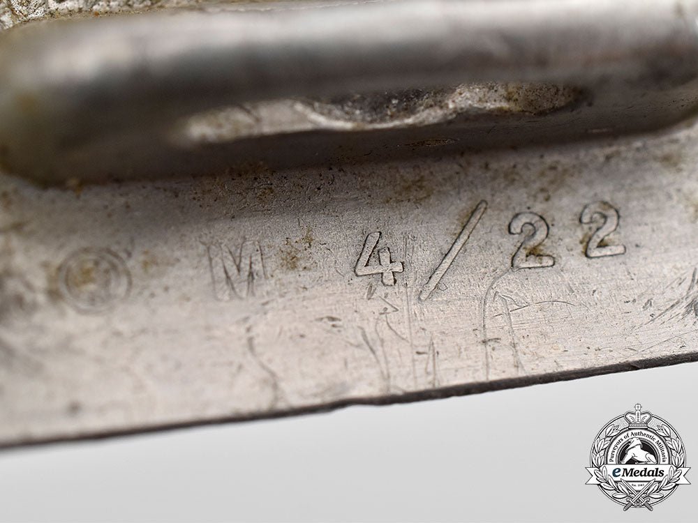1. An HJ Enlisted personnel belt buckle, constructed of aluminum, the obverse bearing a raised German national eagle clutching an HJ insignia, within a ribbed ring bearing an inscription of “BLUT UND EHRE” (“BLOOD AND HONOUR”), the reverse with a loop and swivel attachment claws, marked with a Reichszeugmeisterei (RZM) logo and maker code “M4/22” for Christian Theodor Dicke, Lüdenscheid, measuring 64 mm (w) x 48 mm (h), in extremely fine condition. 2. A DJ Proficiency Badge, Silver Grade, the obverse consisting of a Sig rune, bearing a central mobile swastika, in turn set within a circular ring bearing an inscription of “FÜR LEISTUNGEN IM D.J.” (“FOR MERIT IN THE D.J.”), the reverse with a vertical pinback, marked with a Reichszeugmeisterei (RZM) logo and maker code “M1/63”, measuring 29.44 mm (w) x 45.07 mm (h), weighing 9.0 grams, with loss of finish evident, in very fine condition.