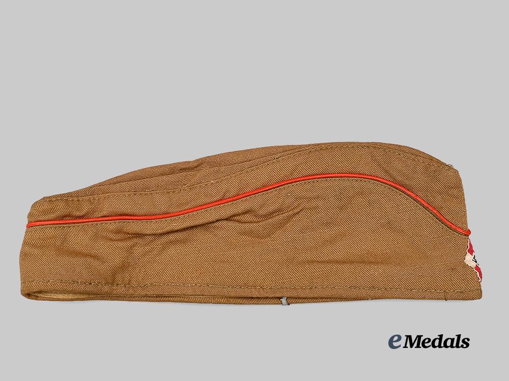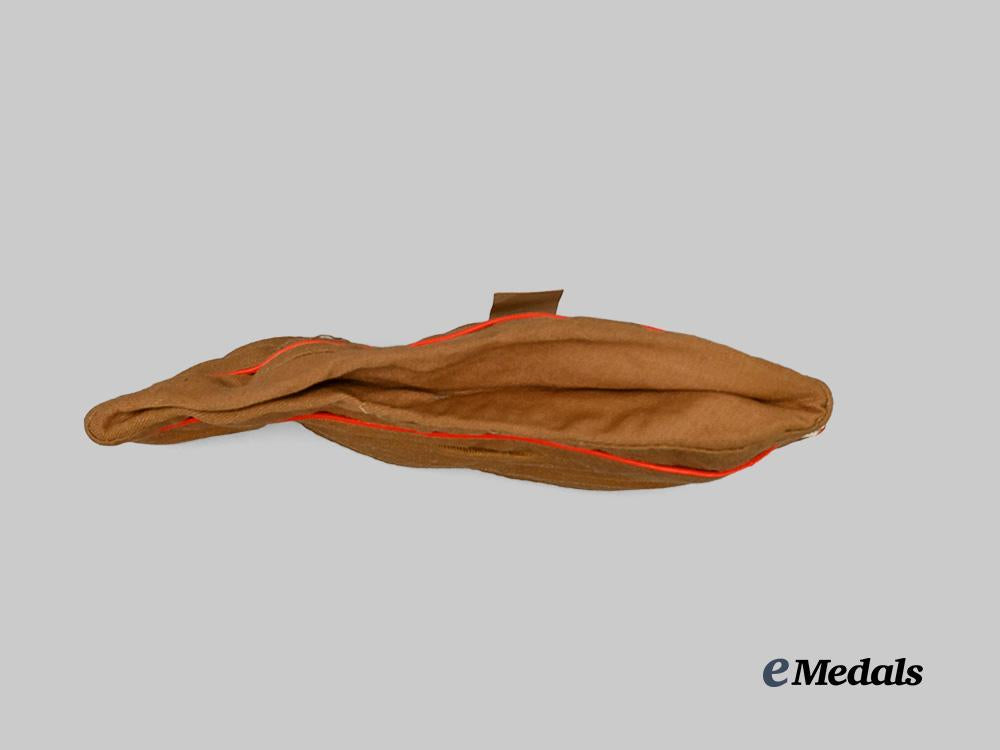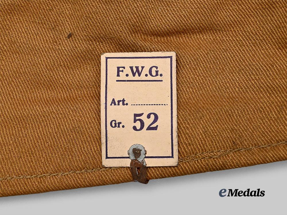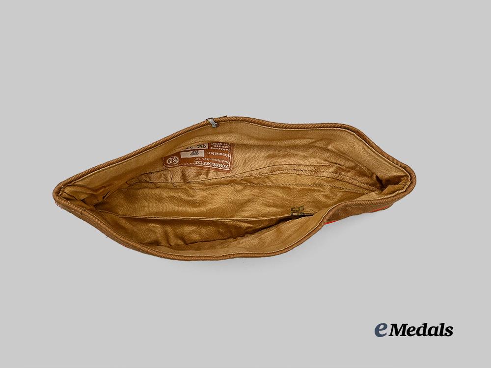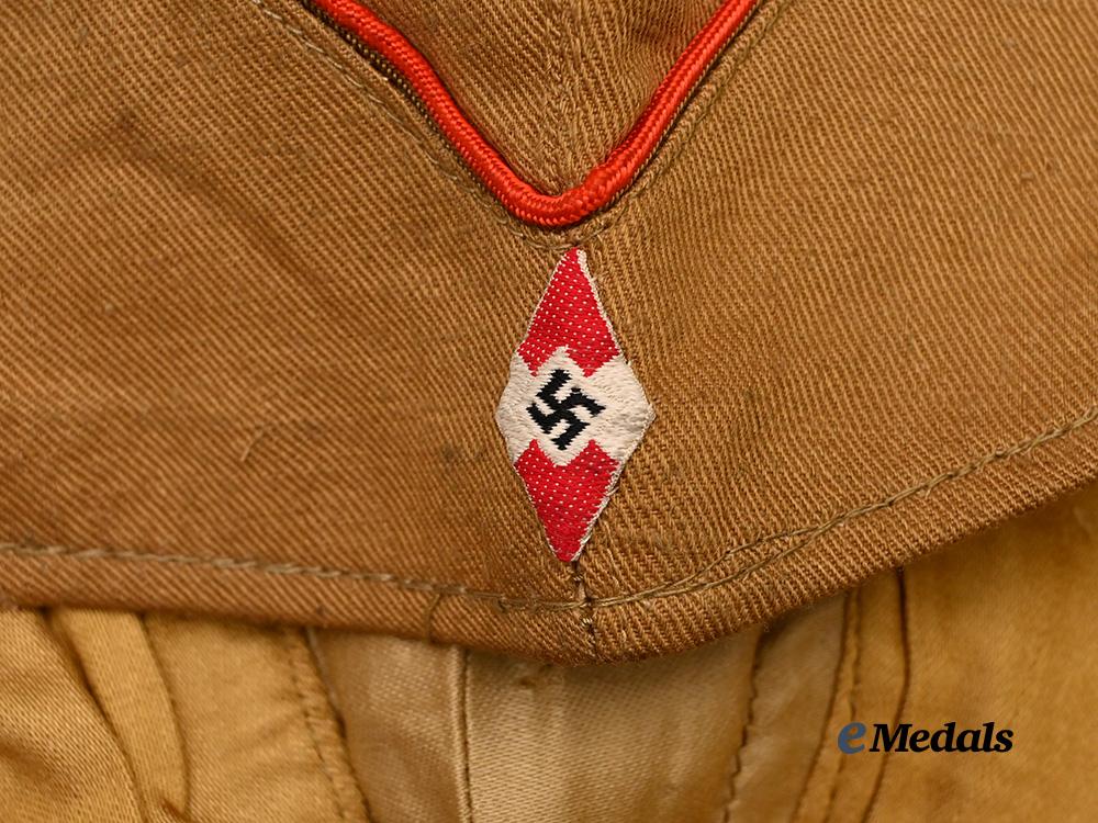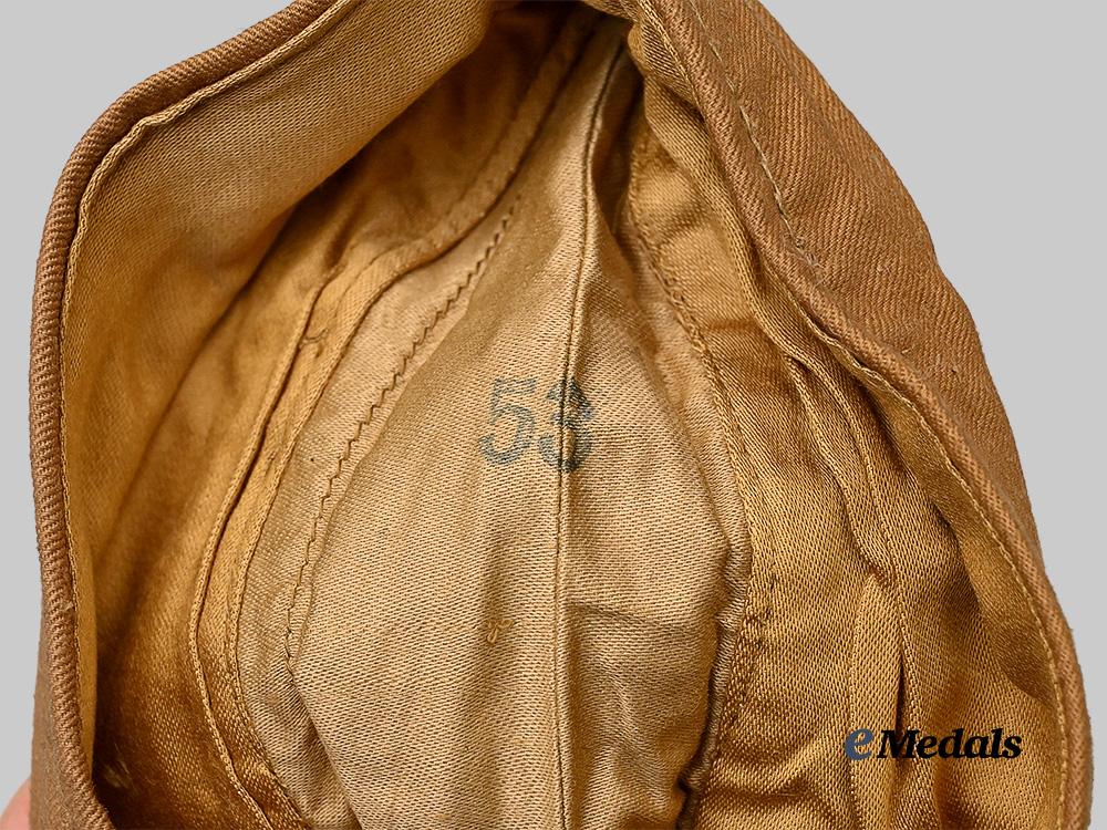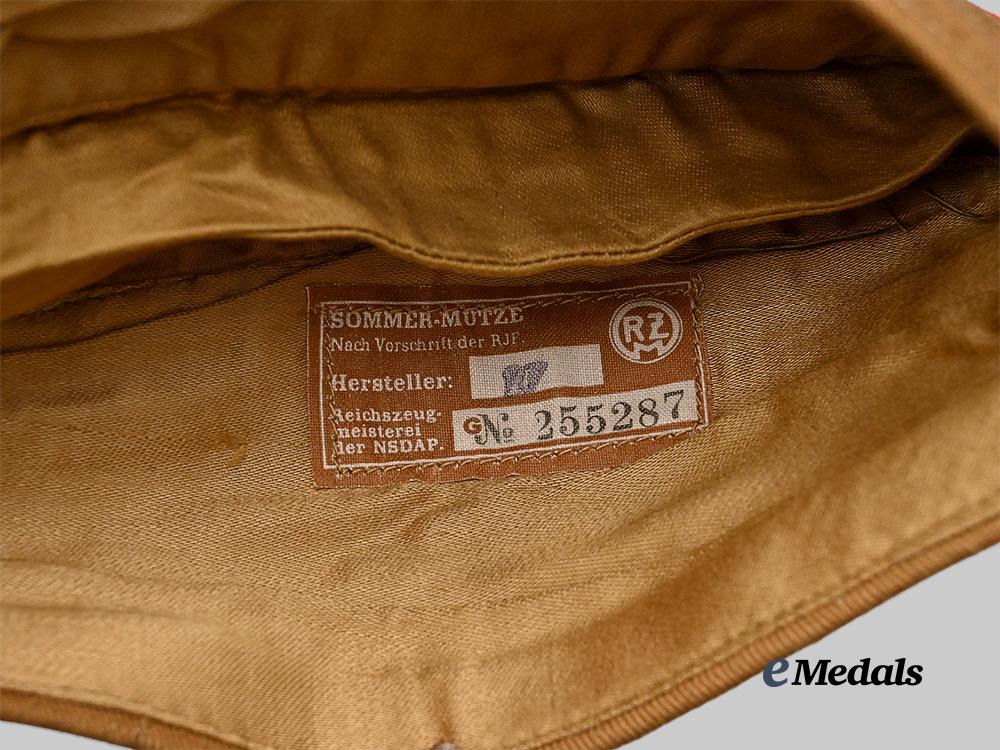 (HJ Sommer-Mütze). An extremely well-preserved HJ field cap, constructed of khaki-tan cotton. The cap is fully surrounded by stylized side walls which are trimmed along the seam with red piping. Stitched onto the lower peak is an HJ insignia executed in red, white, and black machine embroidery, measuring 15 mm (w) x 25 mm (h). A rigid internal reinforcement is palpable along the lower edge, maintaining the cap’s structure, while a light brown rayon liner encompasses the interior. Stitched onto the liner is a fully-intact Reichszeugmeisterei (RZM) label bearing a maker’s code of “27”. Also clipped onto the cap is an original inventory label bearing a size mark of “52”. The cap measures approximately 25 cm (l) x 9 cm (h) when folded on a flat surface. Demonstrating only minor soiling to the base material consistent with age and storage conditions, this unissued cap remains in a near mint condition.