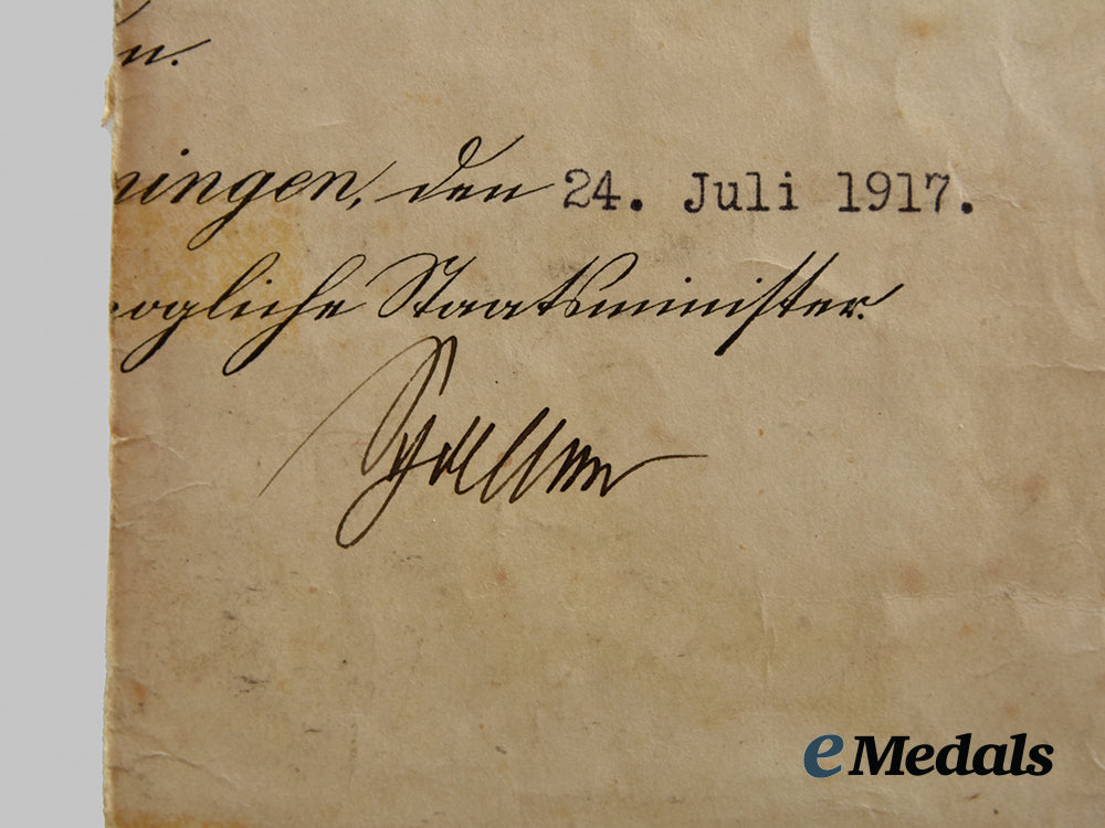 11. An award document for the Saxe-Meiningen War Merit Medal, presented on off-white paper stock with black ink, named to Fröhlich as a Vizefeldwebel of Fusilier-Regiment General-Feldmarschall Graf Moltke (Schlesischer) Nr. 38, 6. Kompanie, in Alt-Gleiwitz, Oberschlesien (Upper Silesia), issued from Meiningen and dated 24 July 1917, measuring 21 cm (w) x 32.5 cm (h), the document has been cut in half along folding seams and demonstrates soiling throughout, in fair condition.