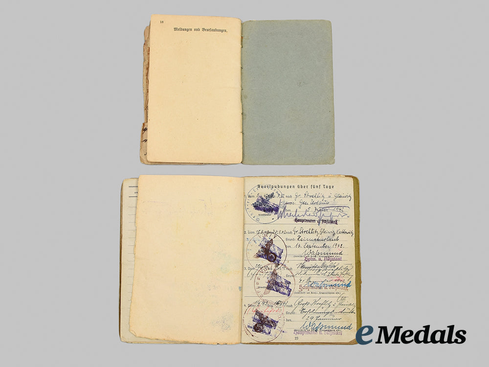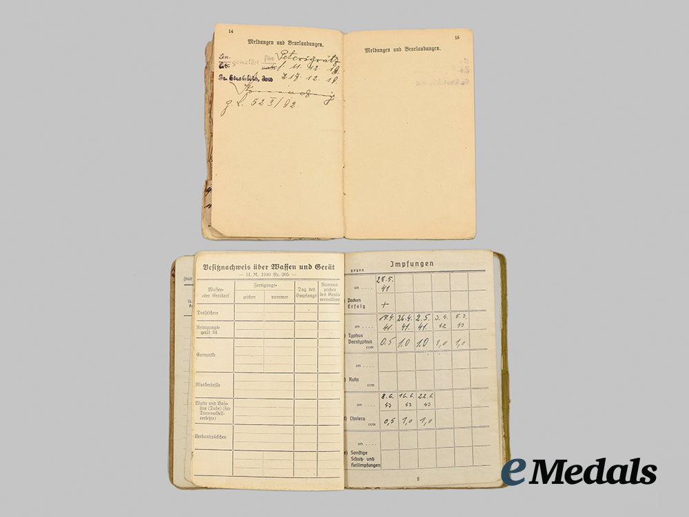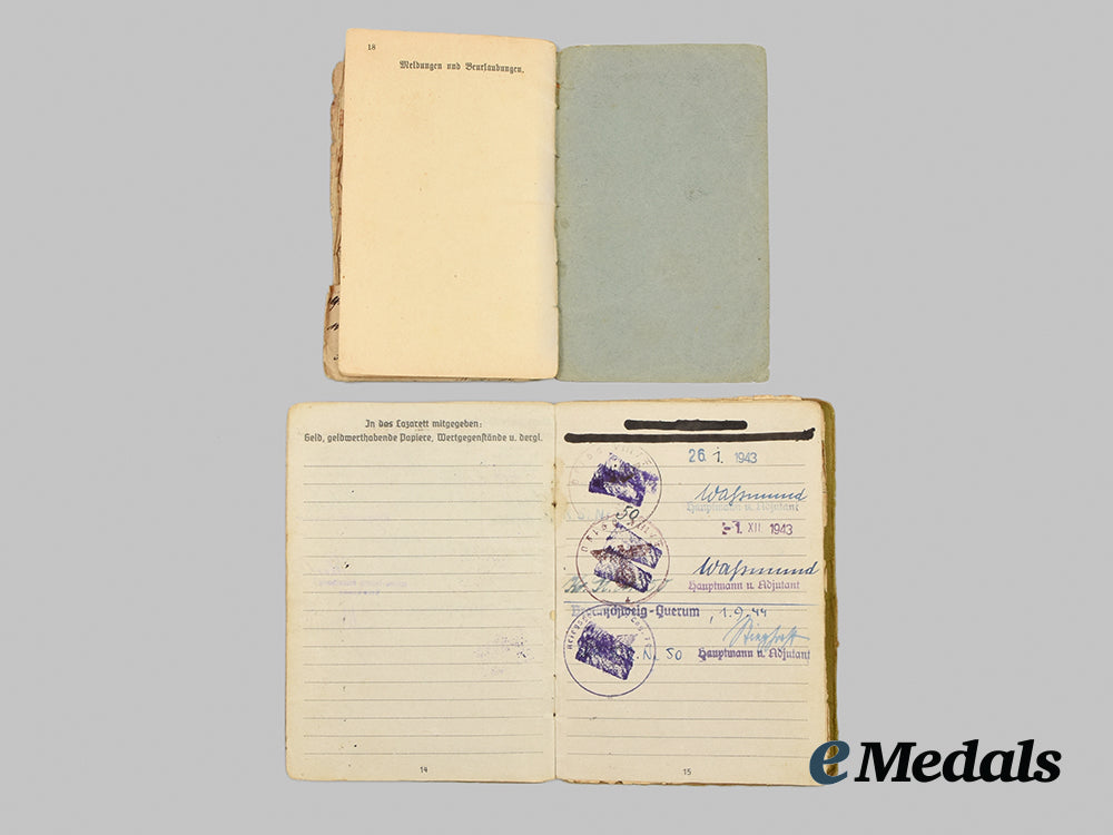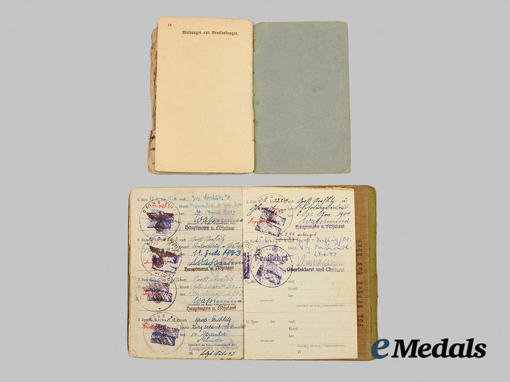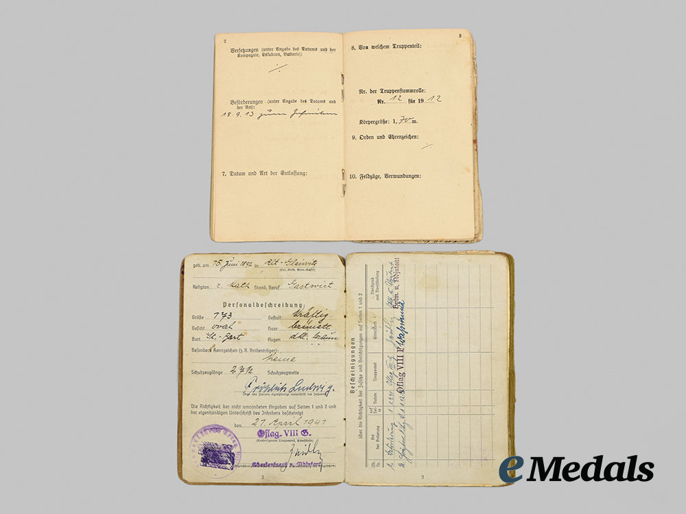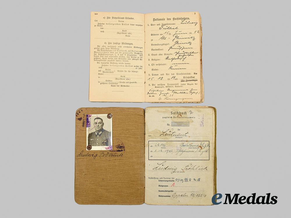 14. A Wehrmacht-issued Soldbuch, constructed of a brown card stock binding with 26 paginated interior pages filled with handwritten and stamped entries, opening with a certified studio portrait of Fröhlich in a Hauptmann’s uniform, issued on 27 April 1941, featuring entries for awards and service, measuring 10.5 cm (w) x 14.5 cm (h), demonstrating moderate material fatigue throughout, in very fine condition.