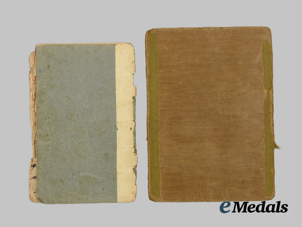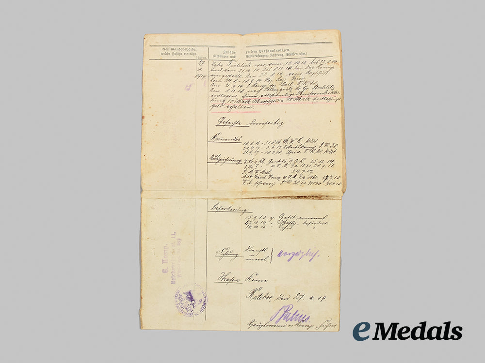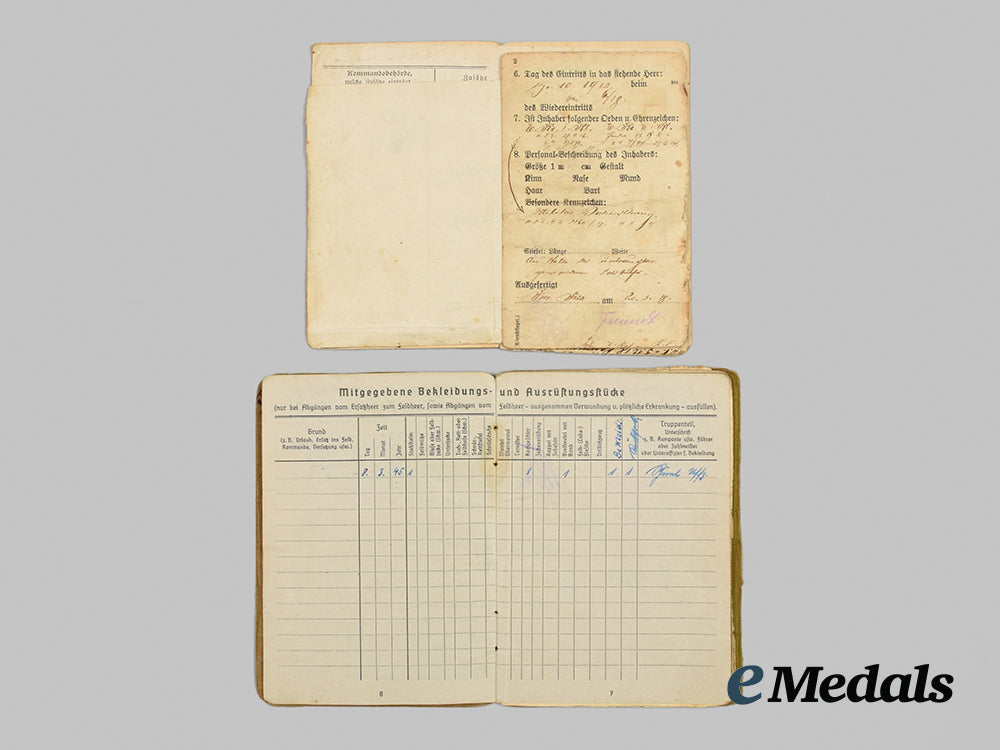 13. A Militärpaß, constructed of a field-grey card stock binding with paginated interior pages filled with handwritten entries, featuring a detailed service record for Fröhlich encompassing both his First World War and post-war Reichswehr service, notably including a handwritten entry for his receipt of the Golden Military Merit Cross, measuring 9 cm (w) x 13.5 cm (h), demonstrating material fatigue and the separation of some papers, in very fine condition.