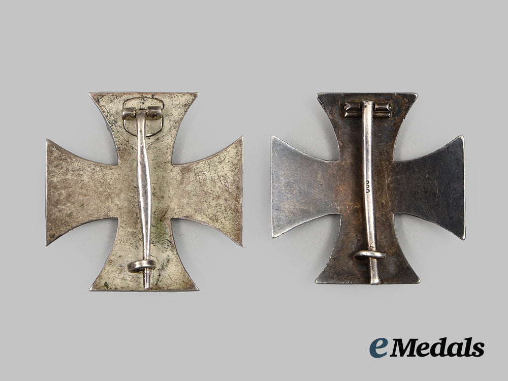 5. A second 1914 Iron Cross I Class, constructed of iron and silver, consisting of a Cross Pattée with a blackened magnetic iron core within a ribbed silver frame, the obverse with a central initial “W”, the six o’clock arm with a reinstitution date of “1914”, the twelve o’clock arm with a royal crown, the reverse with a crimped hinge and narrow banjo-style pinback meeting a flat wire catch, unmarked but demonstrating the characteristics of manufacture by Wilhelm Deumer, Lüdenscheid, measuring 43.24 mm (w) x 43.47 mm (h), weighing 15.2 grams, demonstrating minor loss of finish to high contact points of the core exposing Deumer’s classic copper coating, an official veteran’s piece produced c. 1935 in near extremely fine condition.