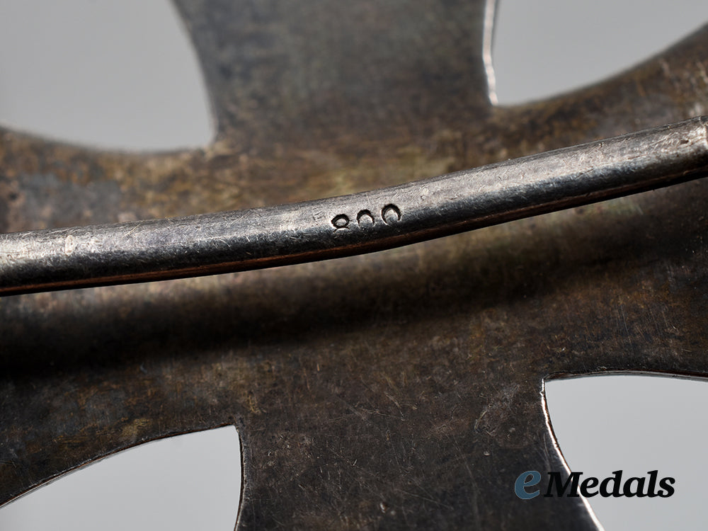 4. A 1914 Iron Cross I Class, constructed of iron and silver, consisting of a vaulted Cross Pattée with a blackened magnetic iron core within a ribbed silver frame, the obverse with a central initial “W”, the six o’clock arm with a reinstitution date of “1914”, the twelve o’clock arm with a royal crown, the reverse with a narrow block hinge and vertical pinback meeting a rounded catch, the pinback stamped with a silver content number of “800”, measuring 42.10 mm (w) x 41.64 mm (h), weighing 17.8 grams, demonstrating loss of finish throughout the core in addition to softening of the frame’s ribbing consistent with friction, a privately purchased example in better than very fine condition.