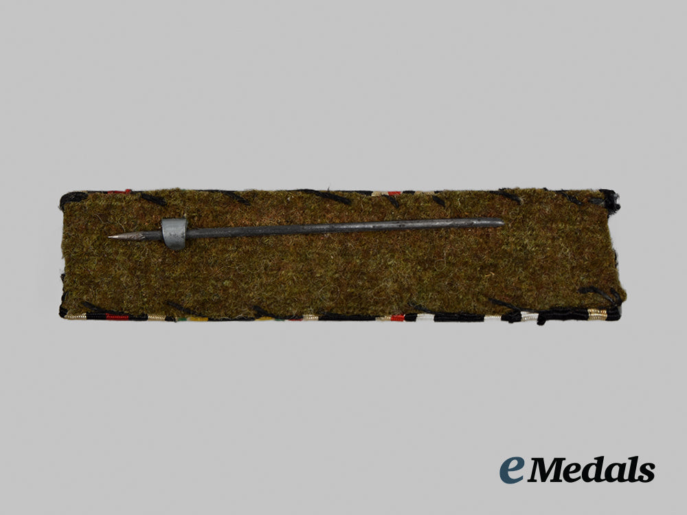 9. A ribbon bar featuring five decorations, including a 1914 Iron Cross II Class, a Golden Military Merit Cross, a War Merit Cross II Class with Swords, a Saxe-Altenburg War Merit Medal, and an Honour Cross of the World War 1914/1918 for Combatants, affixed to a 75 mm-long zink bar with a horizontal pinback and field-grey wool liner, unmarked, demonstrating minor soiling, in near extremely fine condition.