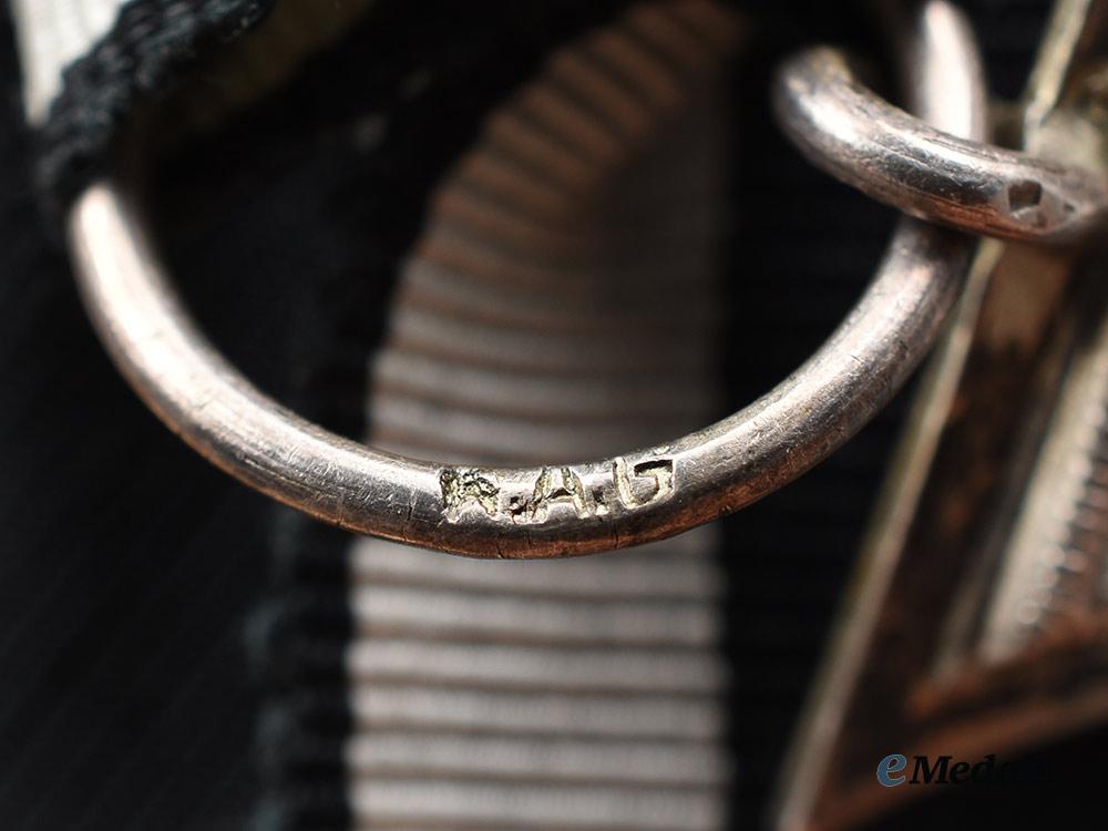1. A 1914 Iron Cross II Class, constructed of iron and silver, on loop for suspension from a Third Reich-period tri-fold ribbon, consisting of a Cross Pattée with a blackened magnetic iron core within a ribbed silver frame, the obverse with a central initial “W”, the six o’clock arm with a reinstitution date of “1914”, the twelve o’clock arm with a royal crown, the reverse with three central oak leaves, the six o’clock arm with an initial institution date of “1813”, the twelve o’clock arm with initials “FW” topped by a royal crown, the suspension loop maker marked “K.A.G.” for a widely-documented but unidentified manufacturer, measuring 44.06 mm (w) x 48.28 mm (h), weighing 18.1 grams, in extremely fine condition.