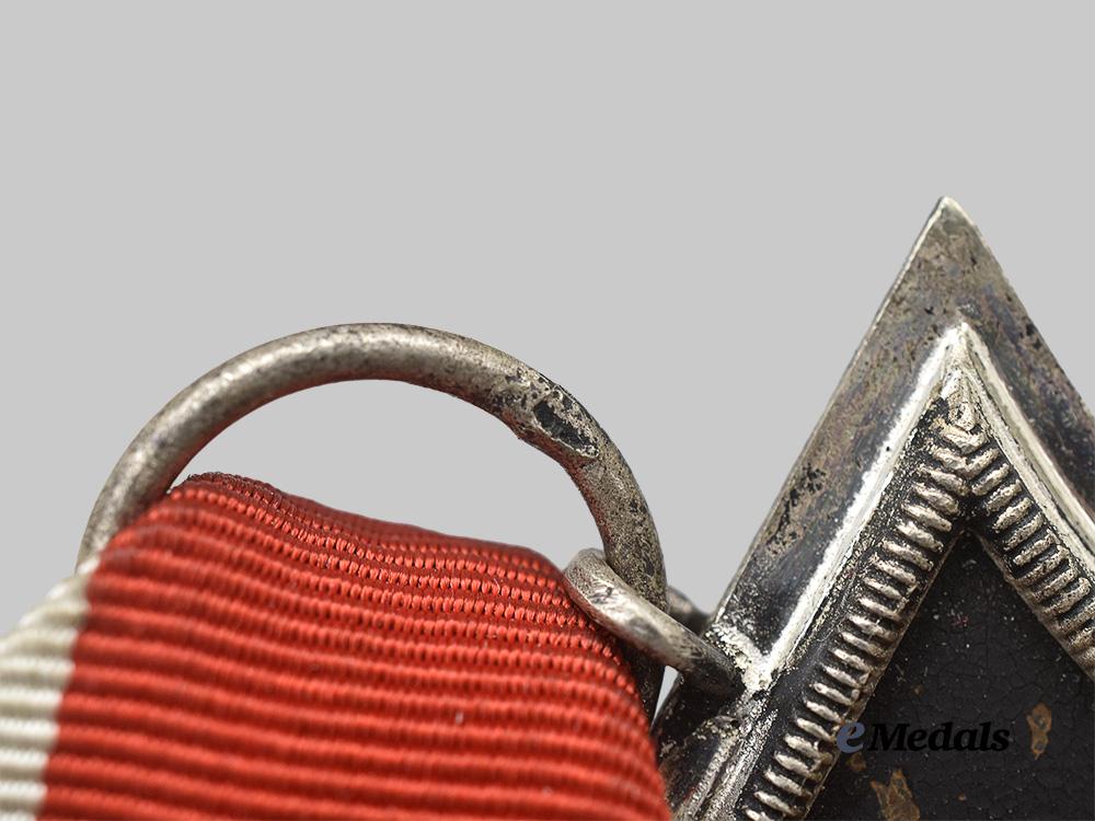 1. A 1914 version, constructed of iron and silver, on loop for suspension from a Third Reich-period tri-fold ribbon, consisting of a Cross Pattée with a blackened magnetic iron core within a ribbed silver frame, the obverse with a central initial “W”, the six o’clock arm with a reinstitution date of “1914”, the twelve o’clock arm with a royal crown, the reverse with three central oak leaves, the six o’clock arm with an initial institution date of “1813”, the twelve o’clock arm with initials “FW” topped by a royal crown, unmarked, measuring 42.85 mm (w) x 46.12 mm (h), weighing 16.1 grams, in extremely fine condition.