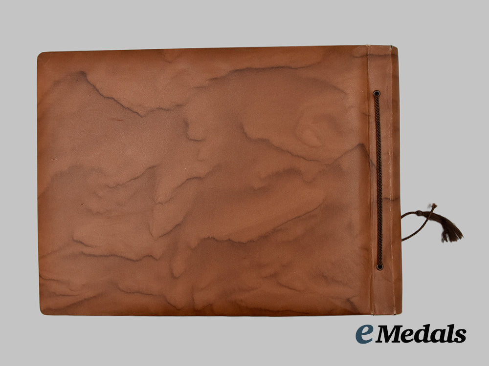 (Kreuzer “Ermden” Album mit Fotos). An extremely well-preserved Cruiser Emden commemorative album, constructed of a heavy card stock binding with a faux brown leather exterior liner, the cover bearing a gilded and finely-detailed depiction of the ship in profile, topped by an inscription of ‘DIENSTERINNERUNGEN UND FAHRTEN MIT KREUZER „EMDEN“‘ (“SERVICE MEMORIES AND JOURNEY WITH CRUISER “EMDEN”), flanked by a coat of arms, the spine perforated with four holes reinforced with magnetic metal grommets through which is looped a drawstring which maintains the album’s structural integrity, the interior content consisting of 50 black card stock pages separated by fully-intact wax paper dividers to protect the images, unmarked, measuring 39.5 cm (w) x 28.5 cm (h), in extremely fine condition; accompanied by 86 black-and-white private photographs of various sizes, each depicting Kriegsmarine personnel and vessels (including the Emden), with images of sailors in uniform at sea and on land, with depictions of the Emden and other Kriegsmarine ships (including E-Boats), some bearing period handwritten captions on the reverse detailing the image, a fascinating primary account of prewar and wartime Kriegsmarine service in overall extremely fine condition.