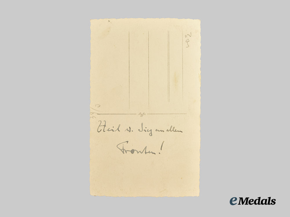 3. A wartime signed postcard of U-Boat ace Fregattenkapitän Heinrich Liebe, depicted in uniform with the Knight’s Cross with Oak Leaves (received 14 August 1940 and 10 June 1941, respectively) expertly inserted in to the image by the issuing studio, the lower left corner overlaid by Liebe’s handwritten signature, the reverse bearing a typewritten dedication from Liebe to a recipient in Landau, Westmark, postage stamped 23 October 1942 in Berlin, measuring 10.5 cm (w) x 15 cm (h), in extremely fine condition.