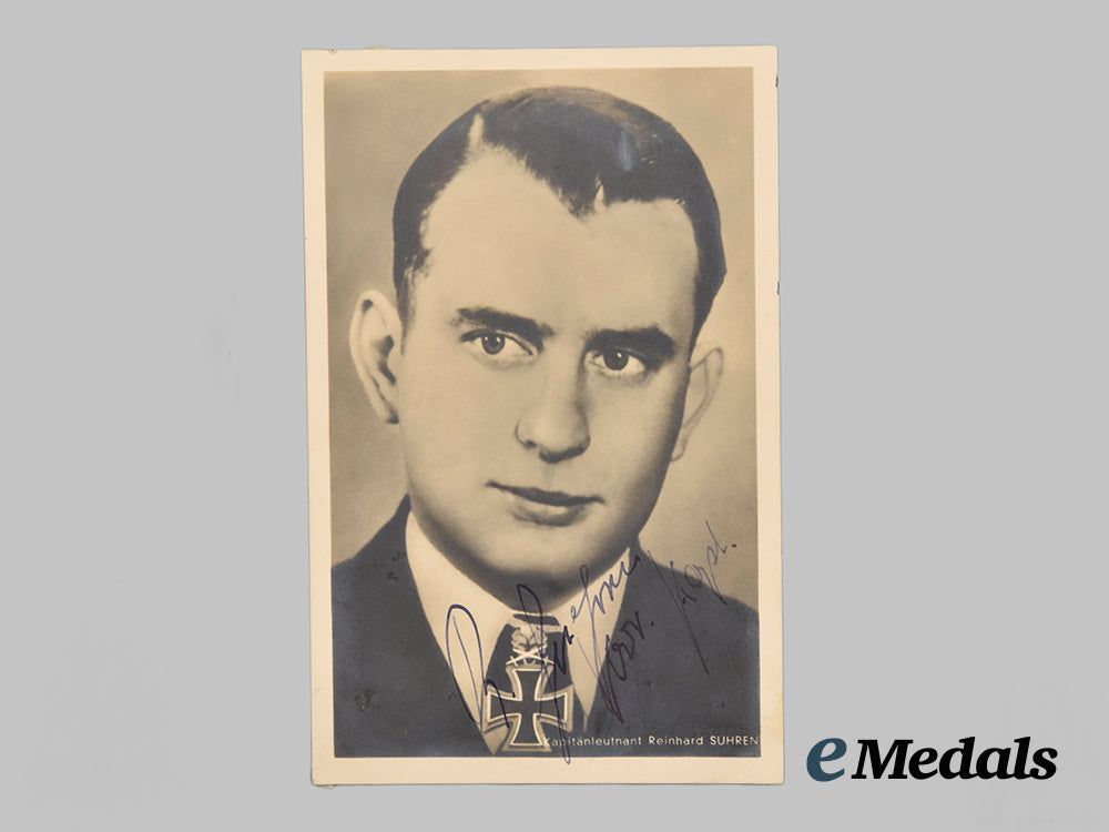 (Kriegsmarine U-Boot-Kommandant Postkarte mit Unterschrift). A signed postcard of Kriegsmarine U-Boat ace Kapitänleutnant (later-Fregattenkapitän) Reinhard Suhren, depicted in uniform and with the Knight’s Cross with Oak Leaves and Swords expertly edited in to the image, the lower half of the image overlaid by Suhren’s handwritten signature, the reverse unused and bearing a Munich studio mark, measuring 9 cm (w) x 14 cm (h), bearing the remnants of an adhesive consistent with previous album display, in extremely fine condition.