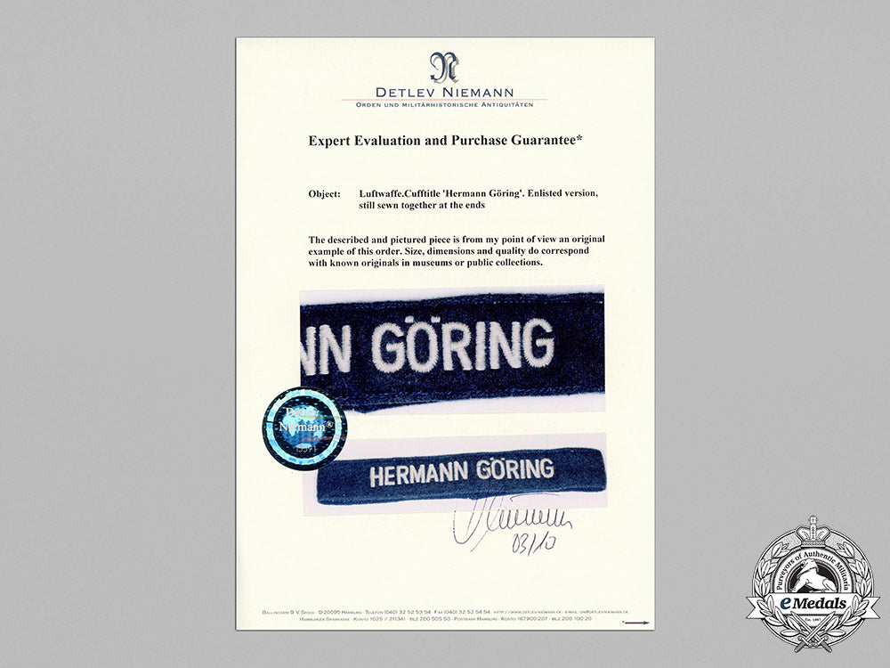 (Fallschirm-Panzer-Division 1. Hermann Göring Ärmelband). Constructed of blue wool, bearing a white, machine-embroidered, block text inscription of “HERMANN GÖRING”, unmarked, measuring 32 mm (w) x 208 mm (l) as presented, a rare example of a cuff title still sewn together, in extremely fine condition.
