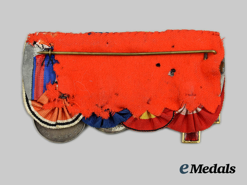 All suspended from 120 mm zink bar with a horizontal pinback and red wool liner, unmarked, minor soiling and wear is visible to the ribbons, with additional mothing and deterioration visible to the reverse liner that reveals First World War-period ribbons (including the Oldenburg Friedrich August Cross) indicating possible padding with surplus materials or reuse of a disassembled bar, in overall very fine condition.