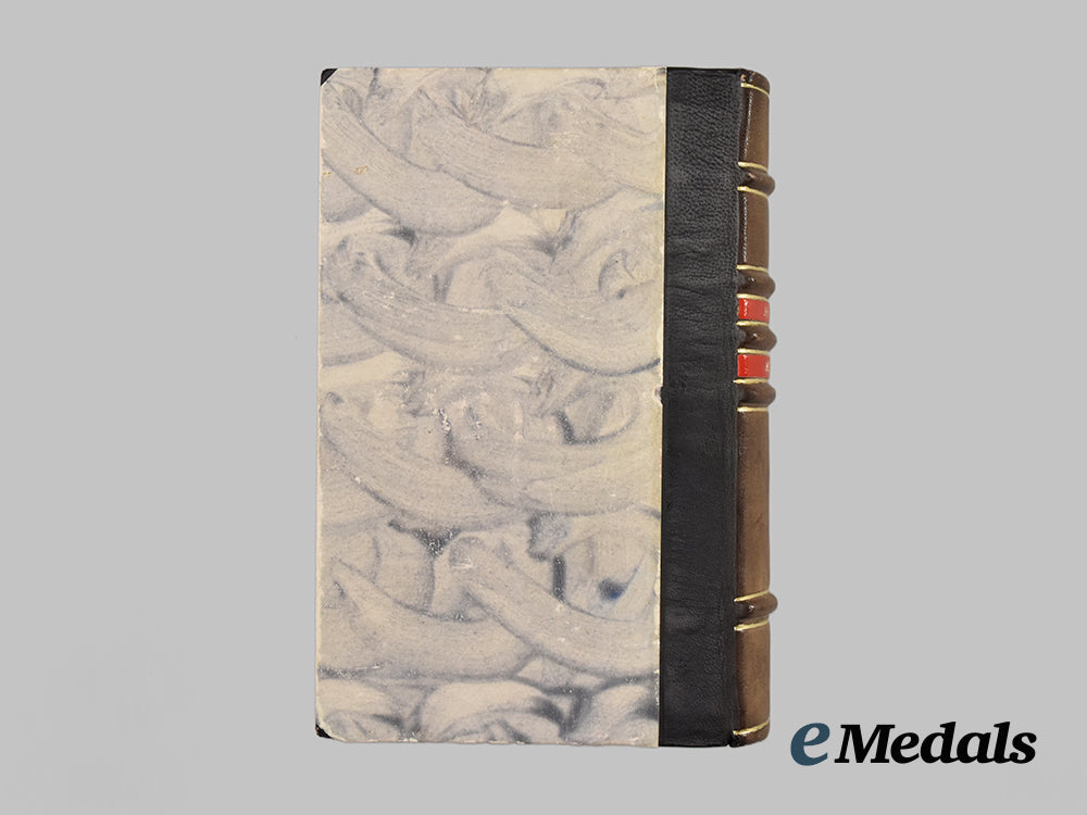 (Mein Kampf). A well-preserved edition of Mein Kampf, constructed of a card stock binding, the spine featuring a faux brown leather reinforcement overlaid by two red bands, in turn bearing a title and author’s name in gilded lettering, the interior content consisting of 781 paginated pages featuring both volumes of the seminal biographical and ideological text of AH and the NSDAP in clear Latin script, issued in 1944 by the main publishing house of the NSDAP in Munich (Franz Eher Nachfolger), printed by Joh. Falk 3 Söhne, Mainz, measuring 13 cm (w) x 18.5 cm (h), demonstrating minor and age-appropriate material fatigue to the binding, in near extremely fine condition.