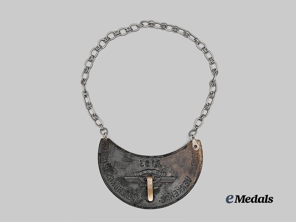 (Nationalsozialistisches Kraftfahrkorps Ringkragen des Verkehrserziehungsdienst). Constructed of aluminum, the obverse bearing a central raised NSKK insignia, topped by an identification number of “2193”, and flanked by an inscription of “NSKK VERKEHRS-ERZIEHUNGSDIENST” (“NSKK TRAFFIC EDUCATION SERVIE”), with domed studs affixed to the top corners, the reverse with two loops affixed to the studs which retain a full-length replacement neck chain, with an additional stabilizing clip emanating from the NSKK insignia, unmarked, measuring 17.5 cm (w) x 12 cm (h), demonstrating total loss of black finish to the obverse resulting in a heavy patina, in addition to the loss of the reverse liner with exposed adhesive, in fair condition.