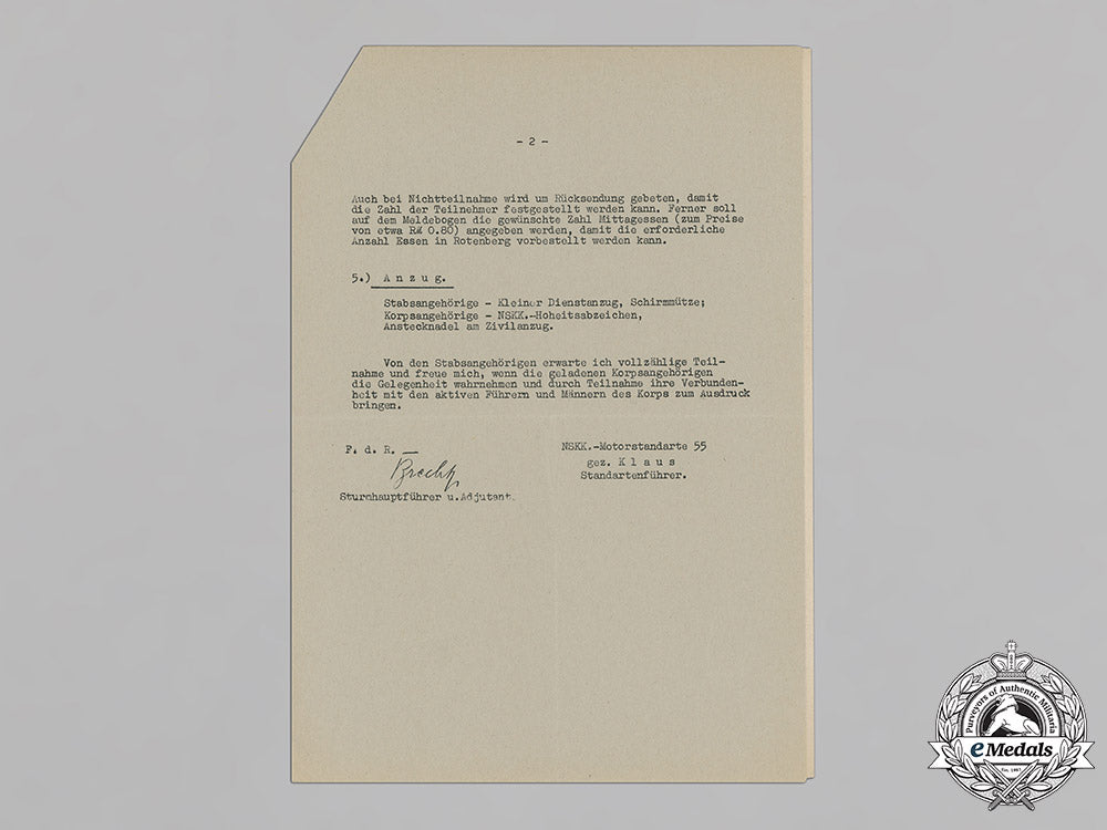 Germany, Nskk. An Invitation To Dr. Porsche And Family To Attend Thanksgiving With Motorstandarte 55