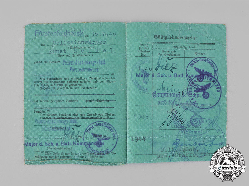 3) A Dienstausweis (Service Identification Card) constructed of linen in celluloid husk, issued to Polizeianwärter Ernst Seidel in Fürstenfeldbruck on 30 July 1940, stamped photograph and signature of owner on back exterior, measures 73 mm (w) x 102.5 mm (h), and in fine condition.