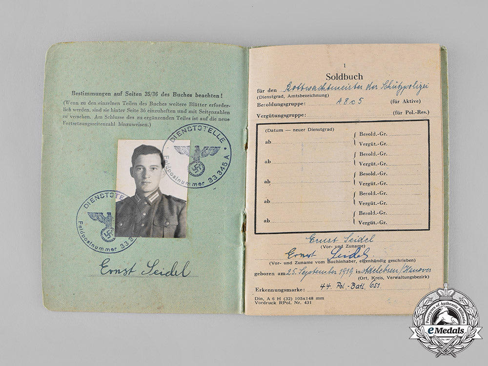 2) A Polizei-Dienstpaß (Police Service Pass) issued on 1 December 1940 to Ernst Seidel. The Service Pass has a light-green, thin cardboard binding with a cover displaying a Polizei-style eagle within a laurel wreath holding a wreathed mobile swastika, below the eagle is the title “Polizei-Dienstpaß” in Gothic script. The owner’s last name is signed in black ink on the top right of the cover. The Pass contains 32 pages with information regarding personal data, Reich labour and military service, employment, training and special courses, special operations, vaccinations, and promotions. The Pass measures 106 mm (w) x 148 mm (h) and is in very fine condition.
