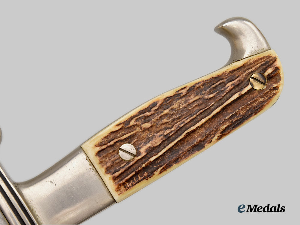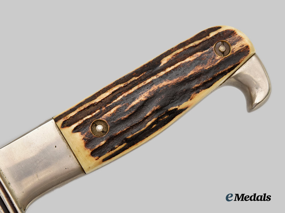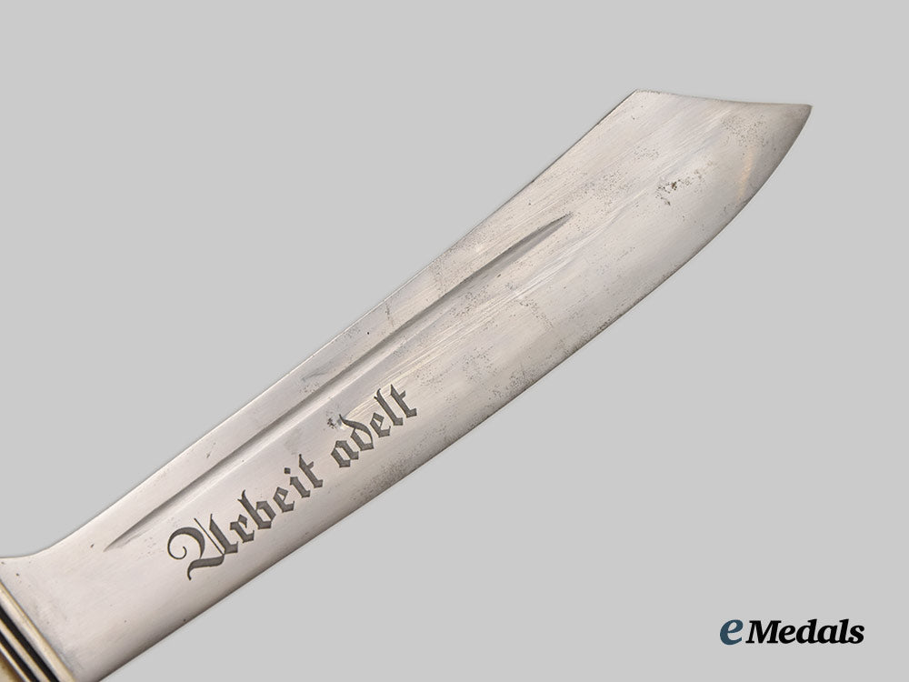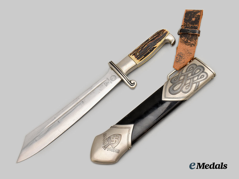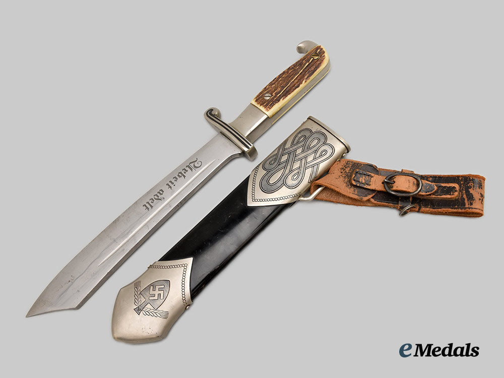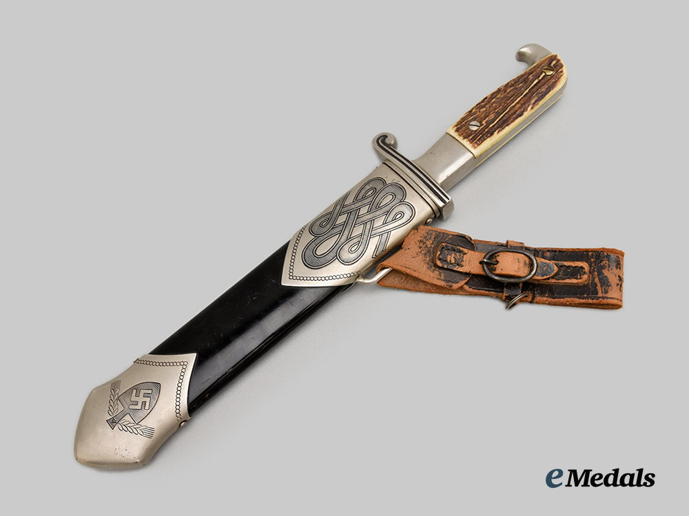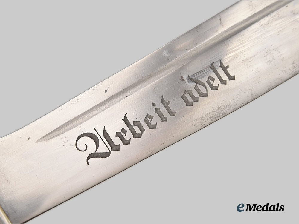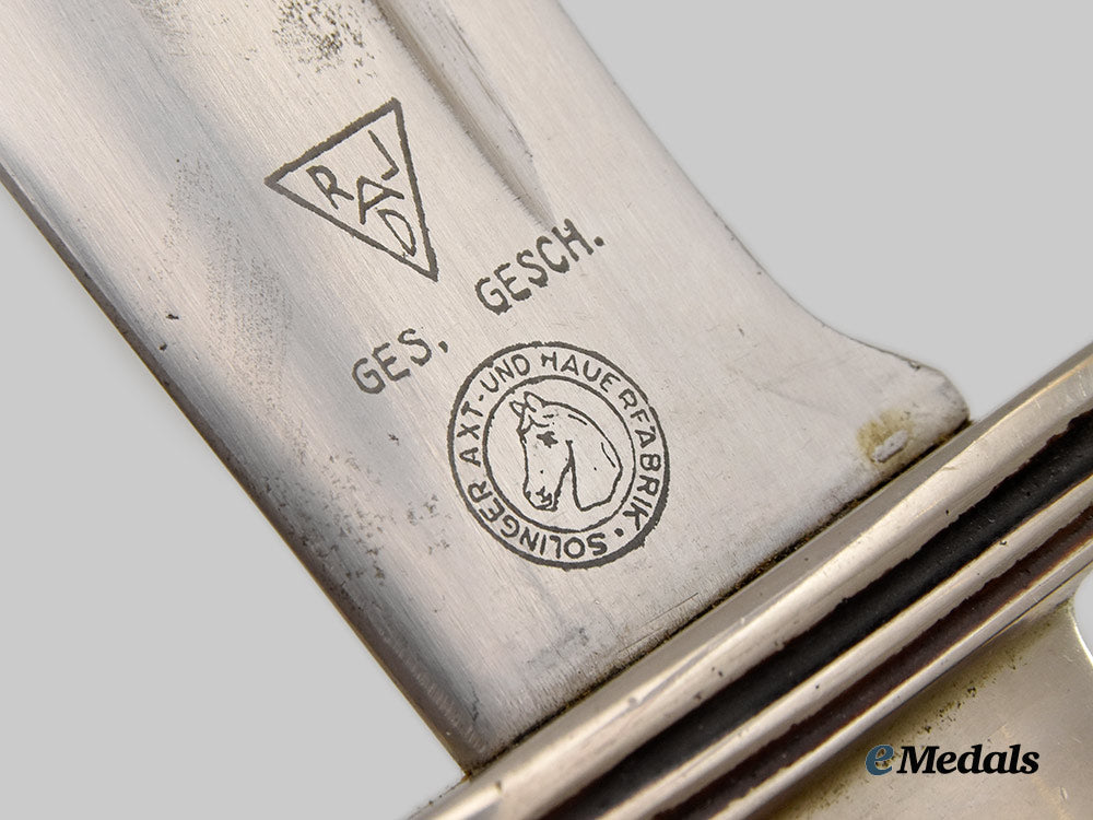 (Reichsarbeitsdienst Hauer für Mannschaften und Unterführer). A well-preserved Reichsarbeitsdienst (Reich Labour Service/RAD) subordinate’s hewer, measuring 39.5 cm in total length when inserted into the scabbard. It features a 24.5 cm-long, nickel-plated, tapering magnetic steel blade with a sharpened tip and narrow fuller running the majority of the length of each side. Acid-etched onto the obverse is an inscription of “ARBEIT ADELT” (“LABOUR ENNOBLES”) in Fraktur script. The reverse ricasso bears a maker’s mark of “SOLINGER AXT- UND HAUERFABRIK”, circumscribing the firm’s horse logo, topped by a Reichsleitung des Reichsarbeitsdienstes (RLAD) insignia. It sits securely within a nickel-plated magnetic metal hilt with a quillon and hooked pommel. Two pieces of polished staghorn compose the handle grip, and are held in place with dual non-magnetic metal rivets. It is accompanied by its original scabbard, constructed of a black painted magnetic metal shaft, with nickel-plated magnetic fixtures secured to both the tip and throat. The former bears double-sided etched RAD insignia, while the latter features etched knotted and ribbed designs. An integral loop emanating from the side of the throat fixture accommodates a period original hanger, constructed of blackened leather and adjusted with a functional buckle. The throat also retains a functional spring catch to firmly hold the hewer in place during storage. Issues consistent with age and wear are evident, and include some running marks to the blade, some scratching of the metal fixtures, and significant fatigue to the hanger which remains structurally intact. An example produced by a scarce and desirable manufacturer, this hewer is in a near extremely fine condition.