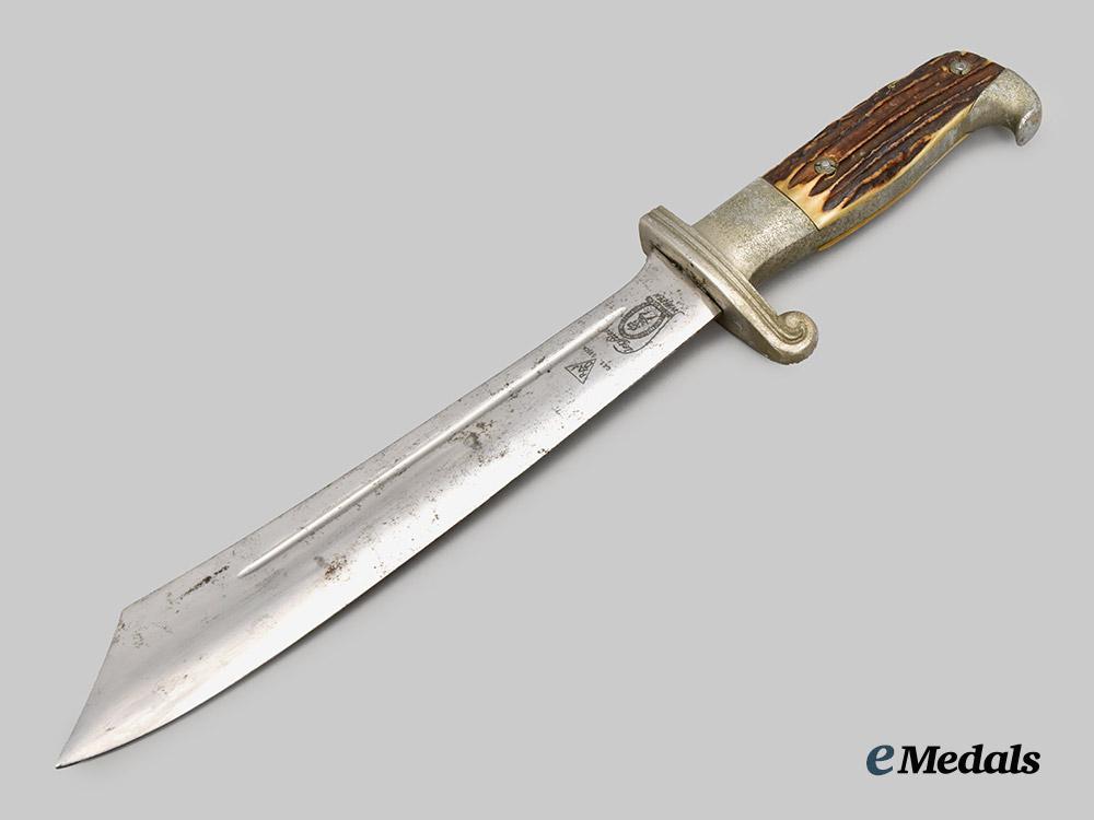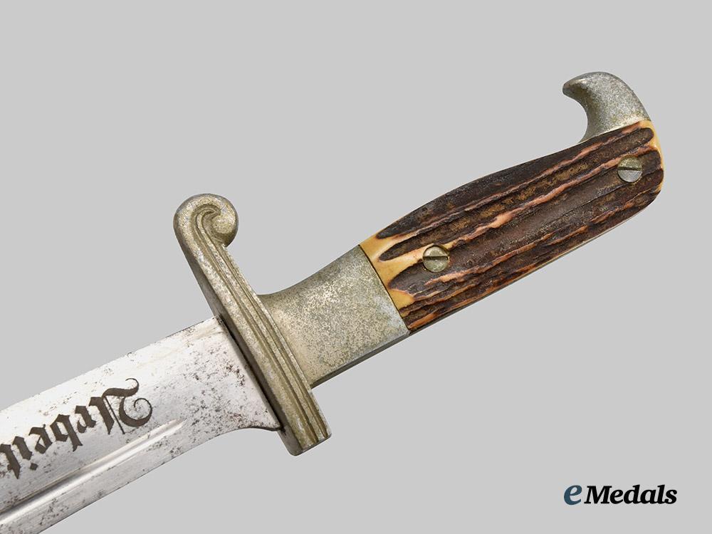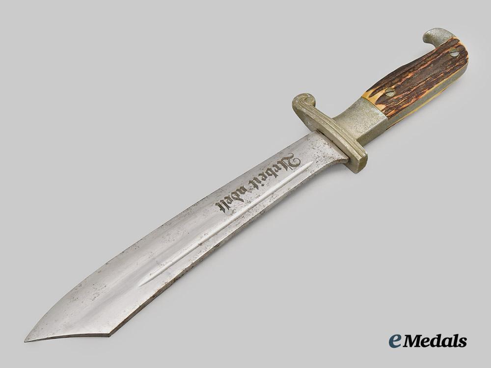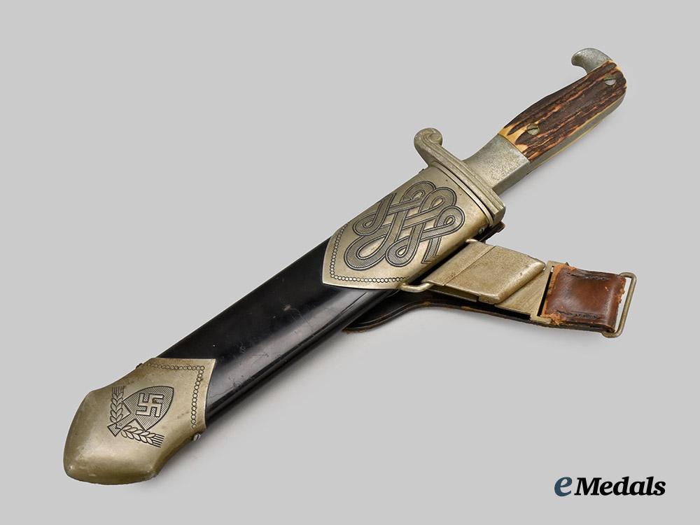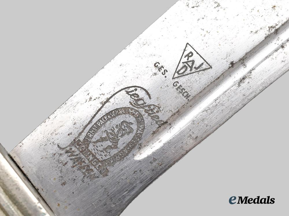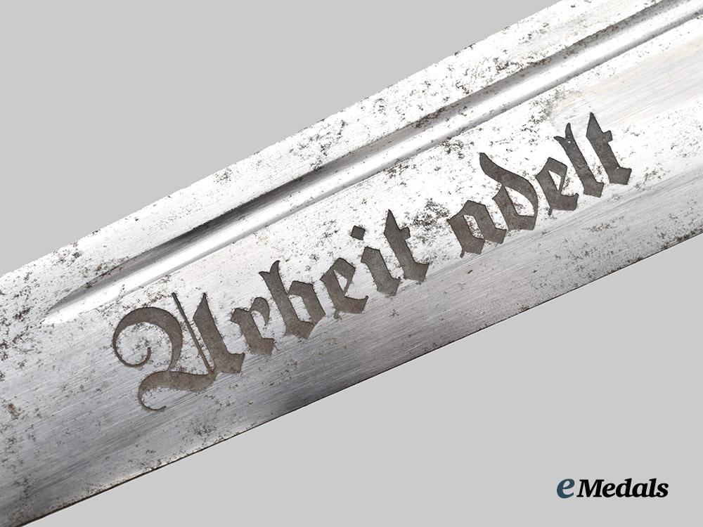(Reichsarbeitsdienst Hauer für Mannschaften und Unterführer). A Reichsarbeitsdienst (RAD) Model 1934 Hewer for Enlisted personnel, measuring 40 cm in total length when inserted into the scabbard. It features a 25 cm-log, nickel-plated, bolo-style magnetic steel blade which retains factory-original sharpening to both the tip and lower edge. Dual narrow fullers run the majority of the length of the upper edge of each side. Acid-etched onto the obverse is an inscription of “ARBEIT ADELT” (“LABOUR ENNOBLES”) in Fraktur script. The reverse ricasso bears a maker’s mark of “ERNST PACK & SÖHNE, WAFFENFABRIK, SOLINGEN”, circumscribing the firm’s classic Siegfried logo. A Reichsleitungs des Reichsarbeitsdienstes (RLAD) logo sits just above the maker’s mark. The blade sits securely within a nickel-plated zink alloy hilt which features a hooked quillon and pommel. Two pieces of polished staghorn compose the handle grip, and are fixed in position with dual non-magnetic metal rivets. Accompanying the Hewer is its original scabbard, constructed of a black painted magnetic metal shaft. Plated magnetic metal fixtures are secured to both the tip and throat. The former bears double-sided etched RAD insignia, while the latter features a double-sided ribbed trefoil design. An integral loop set into the side of the throat fixture accommodates an original hanger, constructed of magnetic steel with a blackened leather strap. The hanger is maker marked with the logo of F.W. Assmann & Söhne, Lüdenscheid. A functional spring catch situated within the throat firmly holds the Hewer in place during storage. Issues consistent with age and wear are evident, and include some running marks and tarnishing to the blade, loss of nickel plating throughout the hilt, and some material fatigue of the hanger. This untouched example remains in a better than very fine condition.