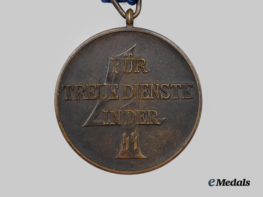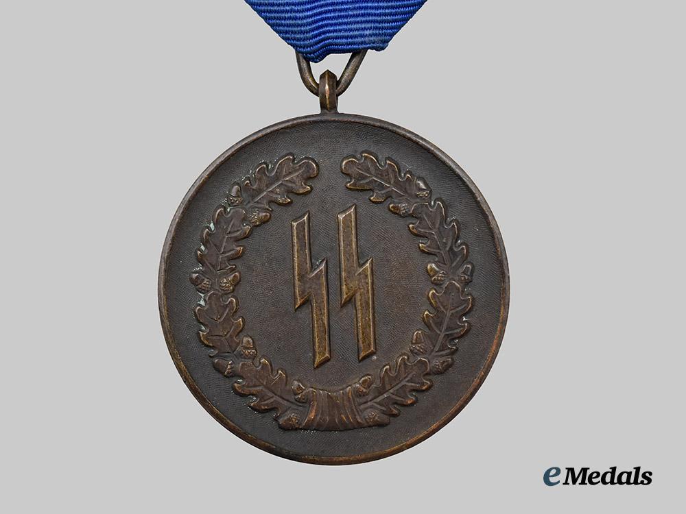 (SS-Dienstauszeichnung, III. Klasse für 8 Jahre). Instituted 30 January 1938. (1938-1945 issue). Constructed of bronze, on loop for suspension from its period original ribbon, the obverse bearing a raised swastika with ribbed arms, overlaid by central double Sig runes situated within a circular oak leaf wreath, the reverse with a raised number “4”, overlaid by an inscription of “FÜR TREUE DIENSTE IN DER SS” (“FOR FAITHFUL SERVICE IN THE SS”), unmarked but demonstrating the characteristics of manufacture by Deschler & Sohn, Munich, measuring 38.02 mm in diameter, weighing 26.1 grams (inclusive of ribbon), the ribbon is missing its pinback, in extremely fine condition.