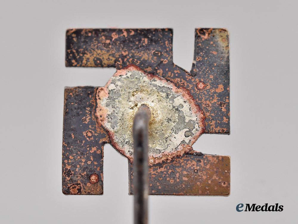 (SS-Dienstauszeichnung I. Klasse für 25 Jahre, Miniatur). Constructed of gilded tombak, the obverse consisting of a swastika with ribbed borders, bearing central raised Sig runes situated within a circular oak leaf wreath, unmarked, measuring 10 mm (w) x 10 mm (h), affixed to its original LDO-issue card stock backer, a stunning and unissued example in near mint condition.