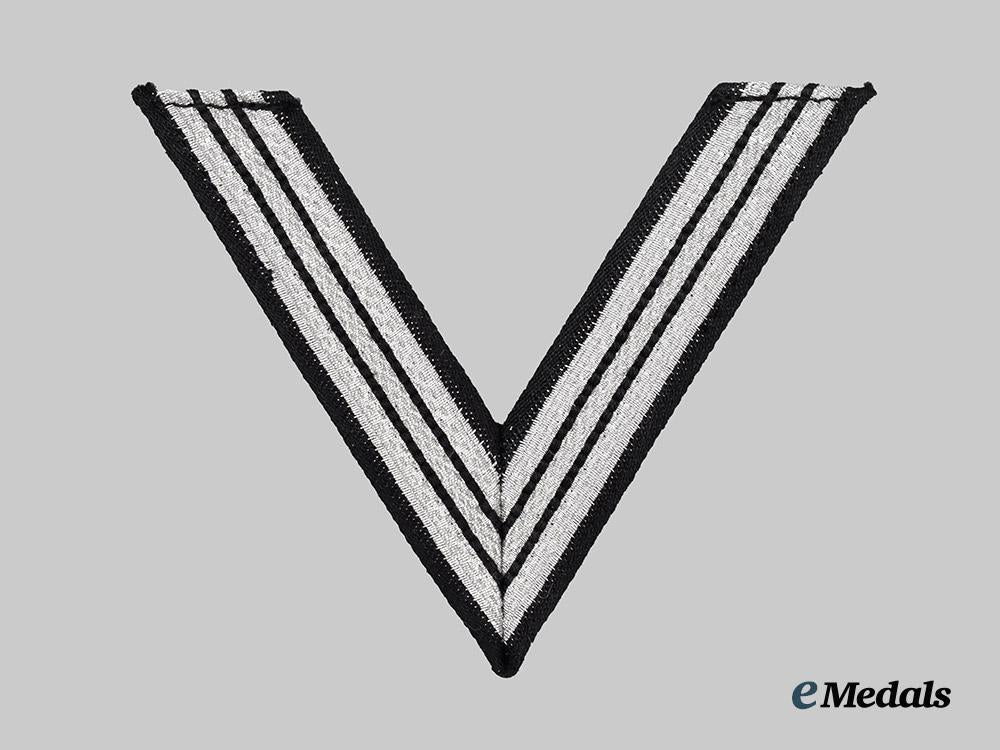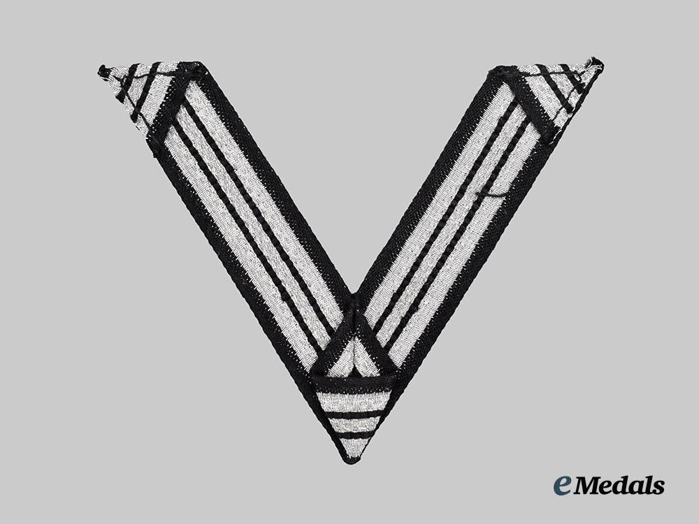 1. An Honour Chevron for Old Fighters, constructed of a silver aluminum wire base, consisting of a chevron trimmed along both the top and bottom edges with black rayon tresses, and overlaid by dual machine-embroidered black rayon bars, unmarked, measuring 80 mm (w) x 70 mm (h), in unissued and near mint condition.