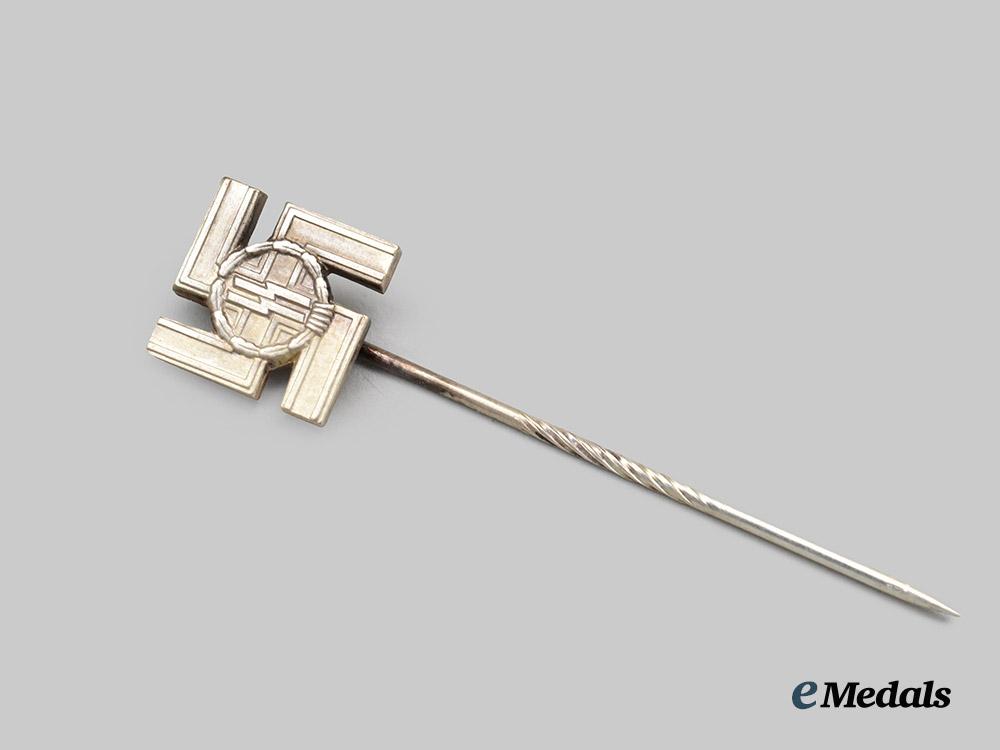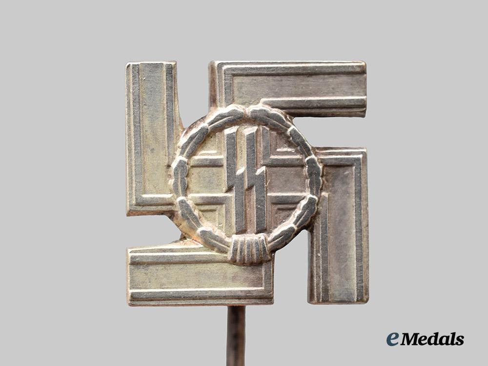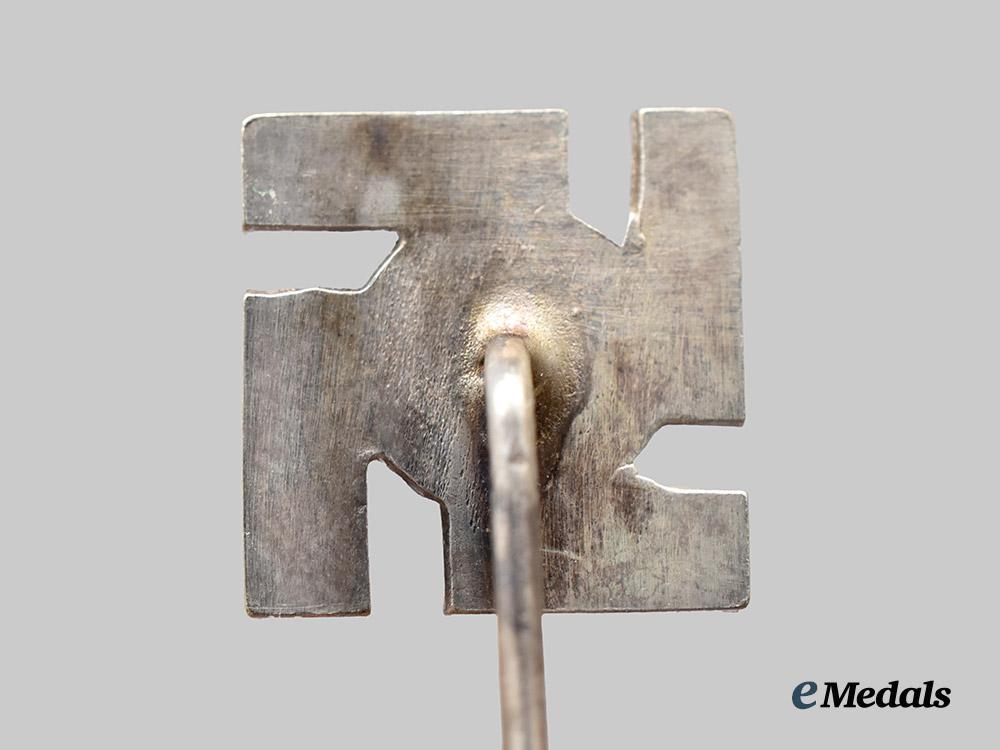 2. A Long Service Award, II Class stick pin miniature, constructed of silvered tombak, the obverse consisting of a swastika with ribbed arms, bearing central double Sig runes situated within a circular laurel leaf wreath, unmarked, measuring 10 mm (w) x 10 mm (h), in extremely fine condition.